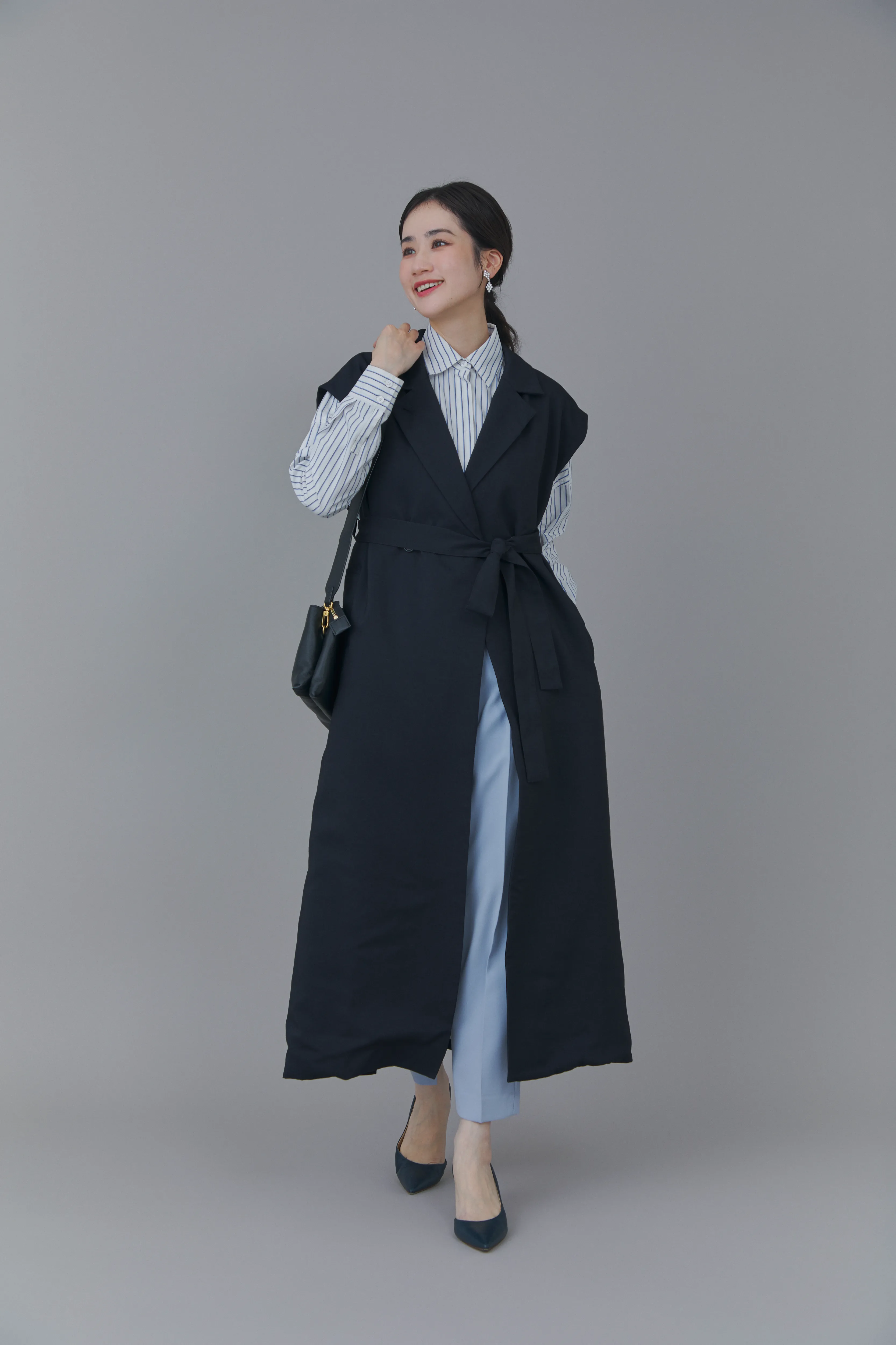 羽織るだけできちんと感と奥行きをプラスできるジレは、春の通勤コーデの頼れる存在。ロング丈を選べば縦のラインが強調され、すっきりとした印象に導いてくれます。重く見えがちな黒のロングジレを選んだ時は、パステルカラーのボトムスで軽やかに抜け感を添えるのが正解。