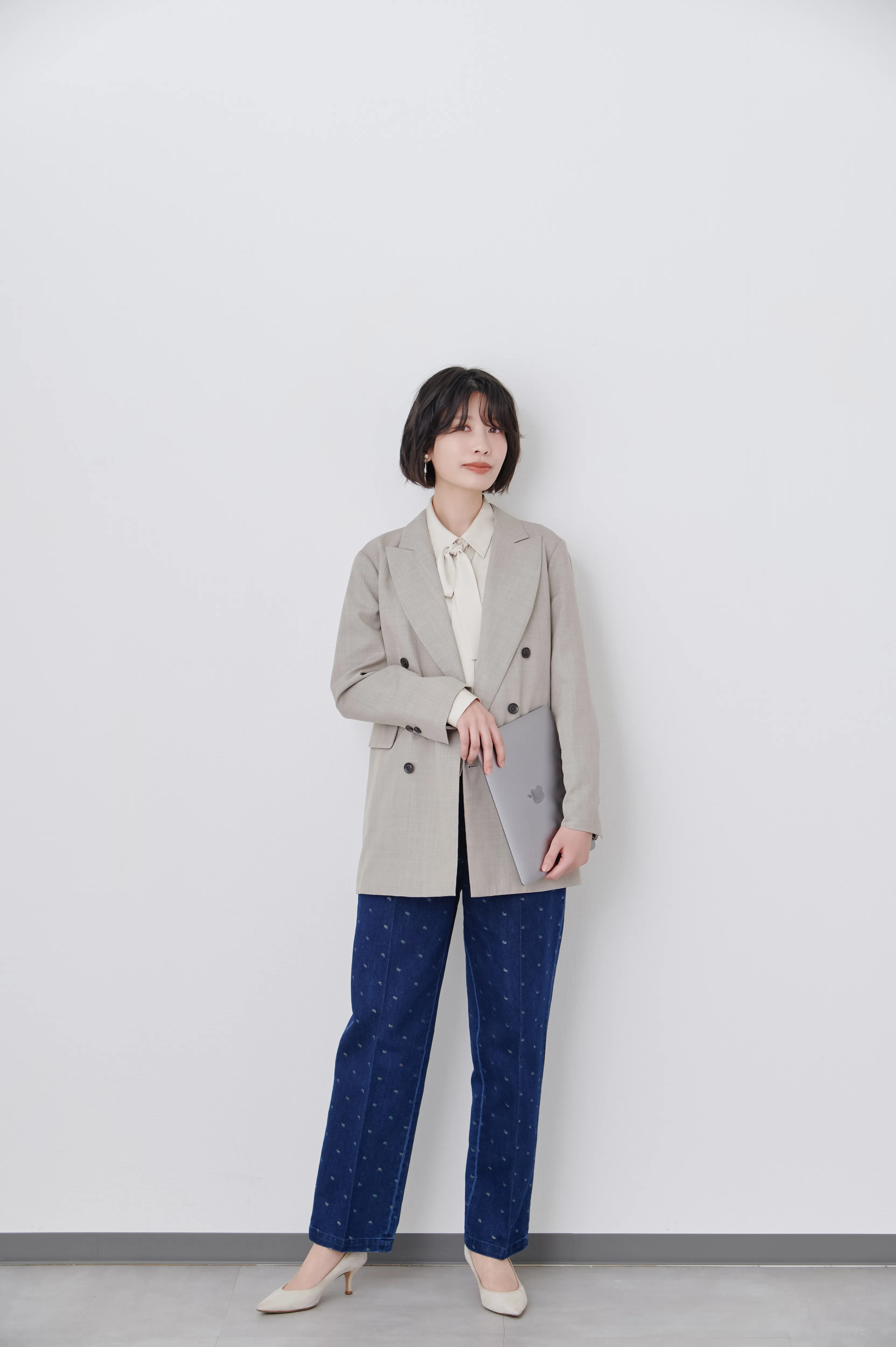 デニム通勤OKな職場なら、センタープレス入りの濃色デニムを選んで、きちんと感を意識。ダブルブレストの端正なジャケットを合わせることで、オフィスにもなじむ上品な印象に仕上がります。足元はパンプスでまとめて、カジュアルさを抑えたバランスに整えるのがポイントです。