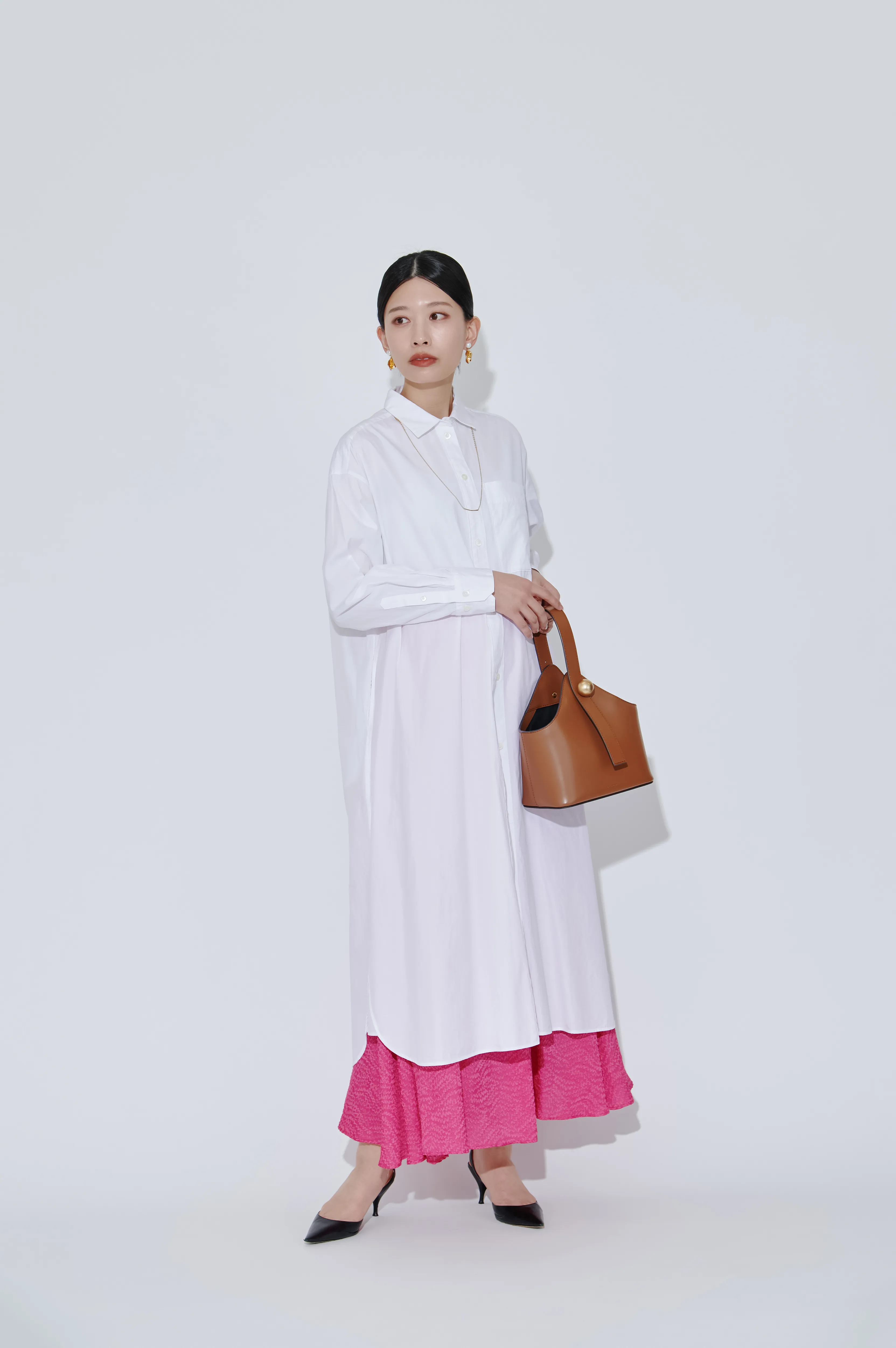 風通しのよいシャツワンピースを主役にすれば、見た目も着心地も軽やかに。1枚でさらりと着こなしつつ、鮮やかなピンクのスカートをレイヤードすることで、春らしい華やかさをプラスできます。バッグはブラウンレザーで引き締めて、通勤にもふさわしいきちんと感をキープ。
