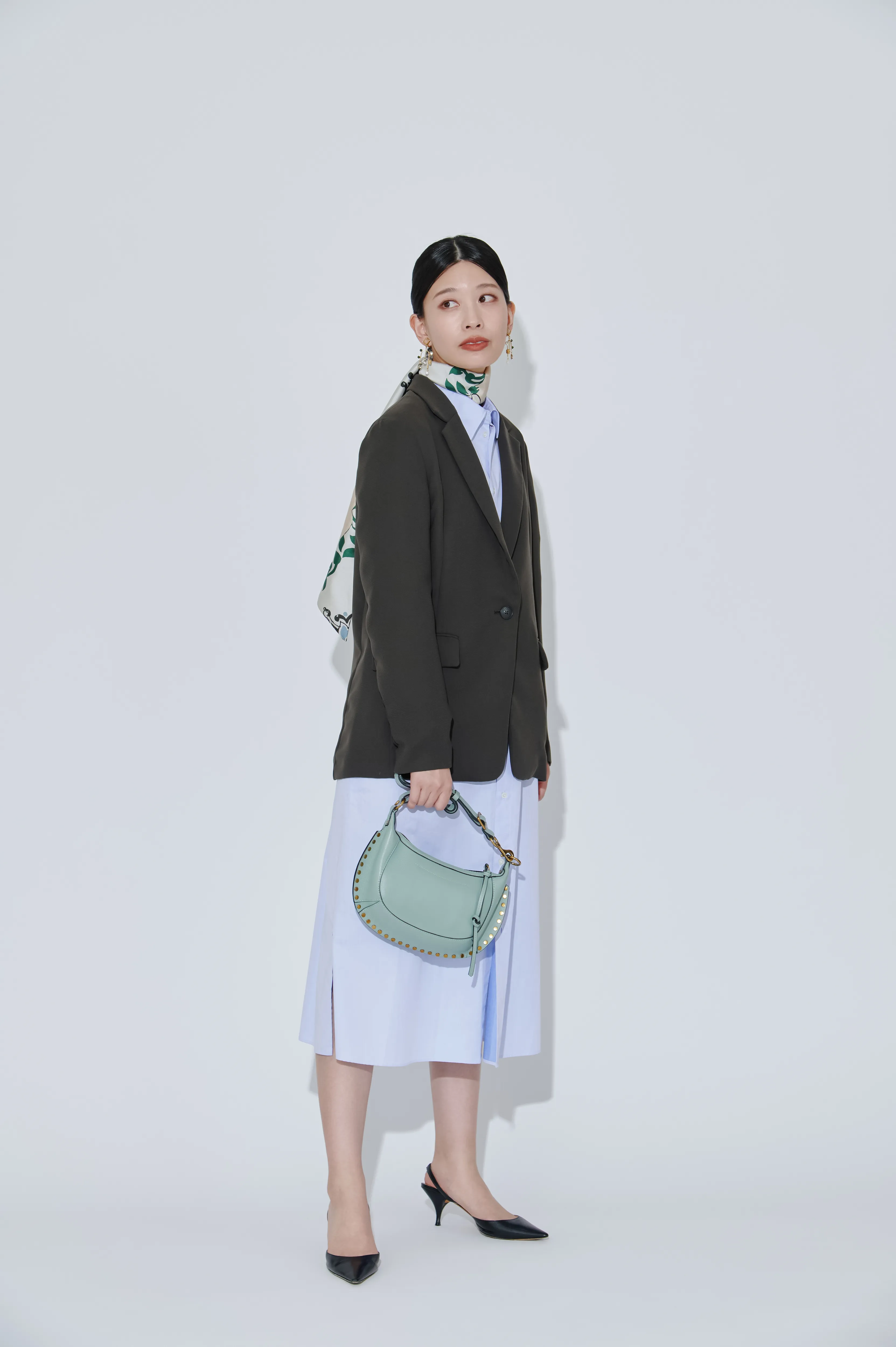 1枚で春らしい爽やかなムードを演出するブルーのシャツワンピースを主役に。ブラウンのジャケットを重ねて、全体をシックに引き締めます。ダマスクプリントのスカーフでエレガントなアクセントを添えつつ、ミントグリーンのバッグで軽やかな彩りをプラス。きちんと感と華やかさを兼ね備えた、こなれた通勤スタイルに。