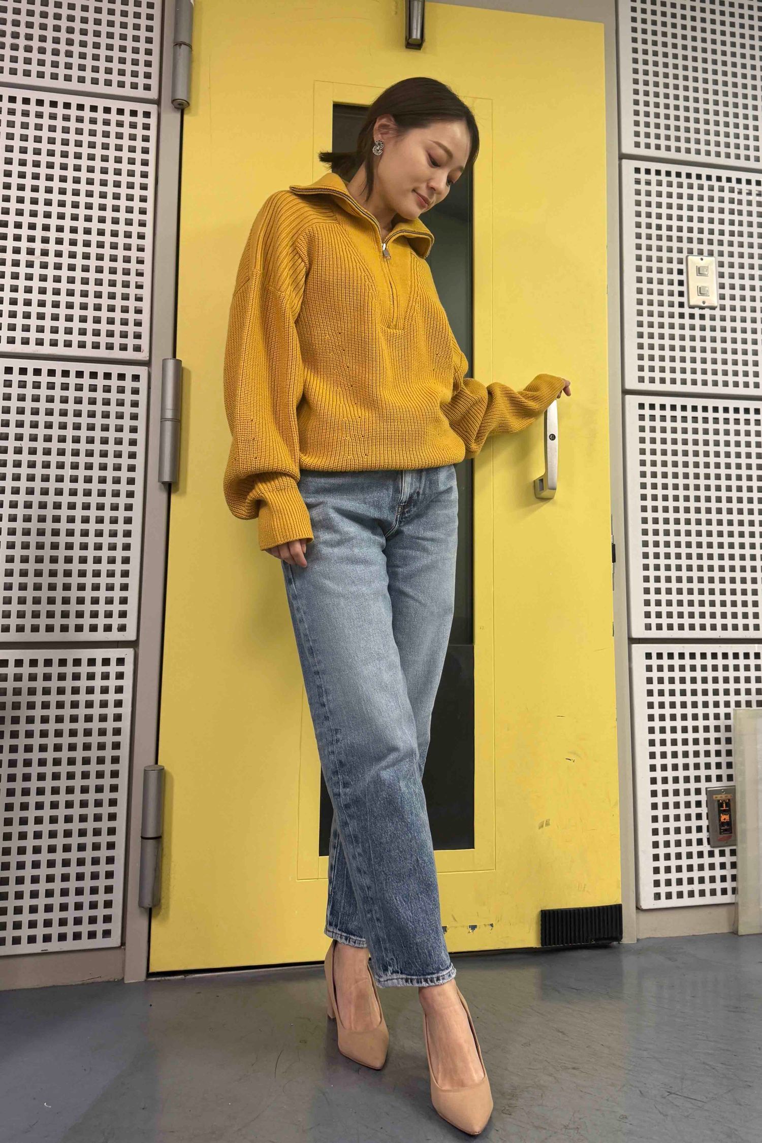 1月第1週目の衣装は、イザベル マラン エトワール(ISABEL MARANT ÉTOILE)のニット。「最近、襟元がジップになっているニットすごく流行っていますよね!街でもよく見かけます。このニットは、大人っぽいくすみイエローの色味が素敵♪」(chayさん・以下同)
