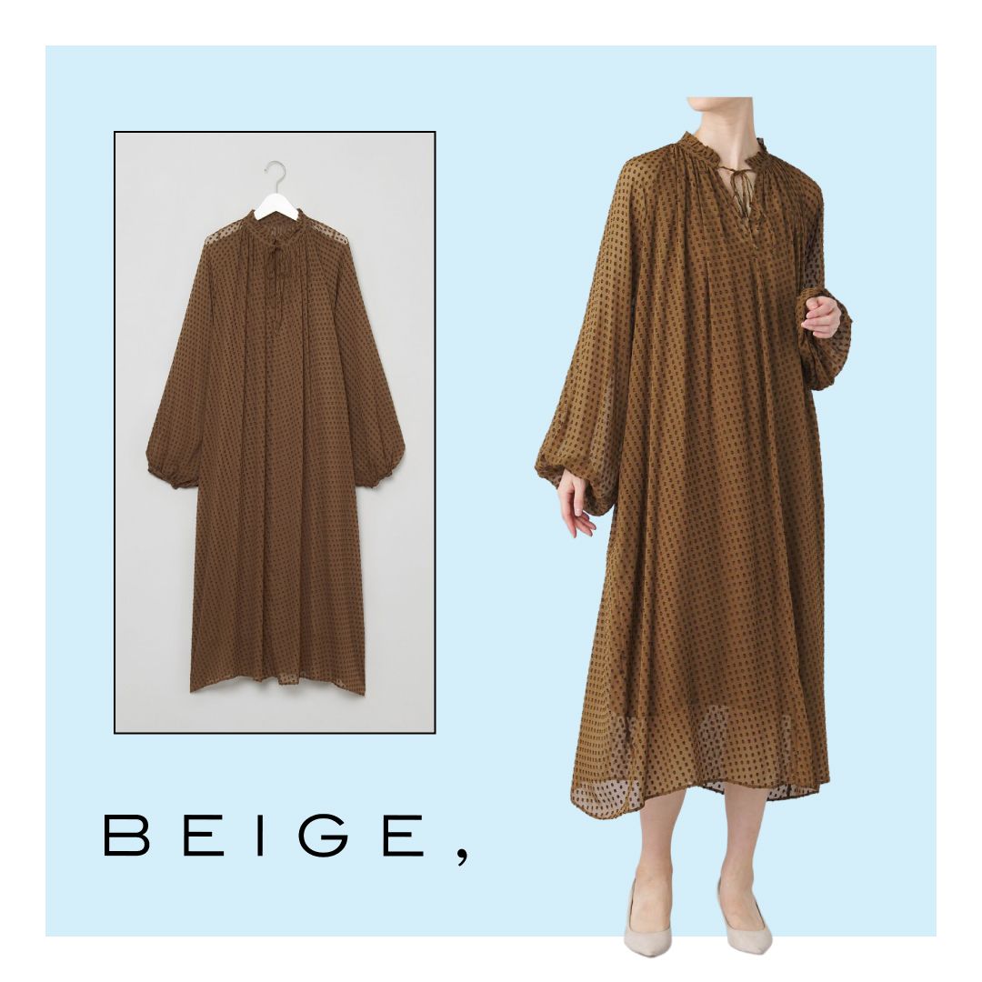 また、オフィスカジュアルにぴったりなワンピースも豊富で、2025年秋冬の新作・ドット柄ワンピースは、たっぷりとしたドレープやギャザーが本当に美しい1着。やわらかいシアー素材に今季トレンドのブラウンを掛け合わせたデザインで、パンプスを合わせれば通勤に、ロングブーツを合わせれば休日にと、オン・オフ問わずご着用いただけると思います。