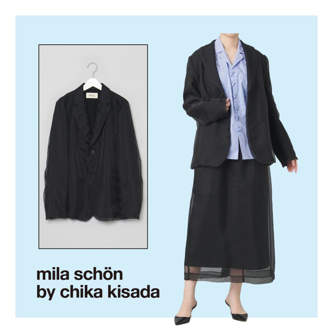 ミラ ショーン バイ チカ キサダ(mila schon by chika kisada)は、クリエイティブディレクターにチカ キサダ(Chika Kisada)やレキサミ(REKISAMI)のデザイナーを務める幾左田千佳さんを迎え、2023年春にデビューしたブランド。ミラ・ショーンのアーカイブをインスピレーションにしながら、新しい視点で再解釈したアイテムを展開しています。