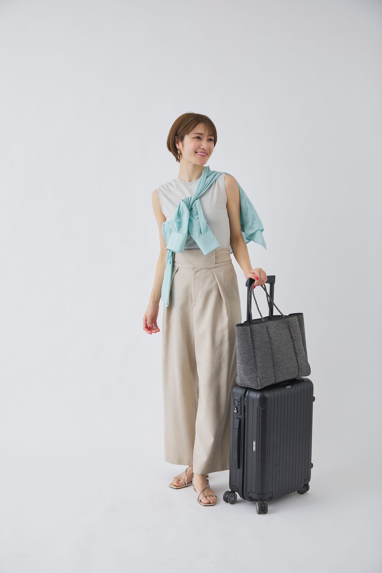5月はゴールデンウィークもあり、旅行を楽しむ人が多い季節。春から夏へと移り変わるこの時期は、寒暖差に対応できる服選びがポイントです。ノースリーブトップスに長袖シャツを重ねれば、暑いときはシャツをたすき掛けにして、こなれ感を演出できて◎。ボトムスは、着心地の良さとスタイルアップを両立できるハイウエストのワイドパンツがおすすめです。