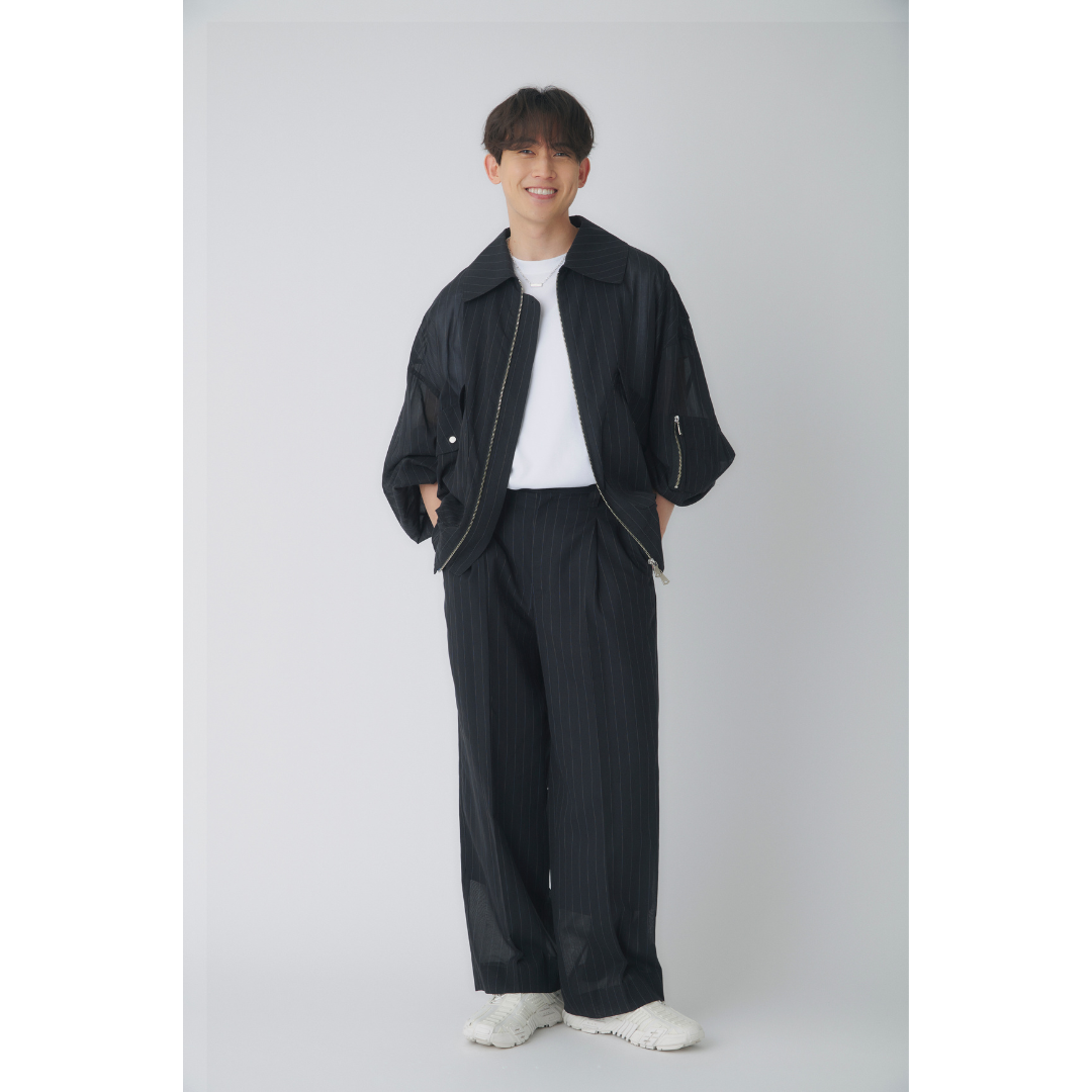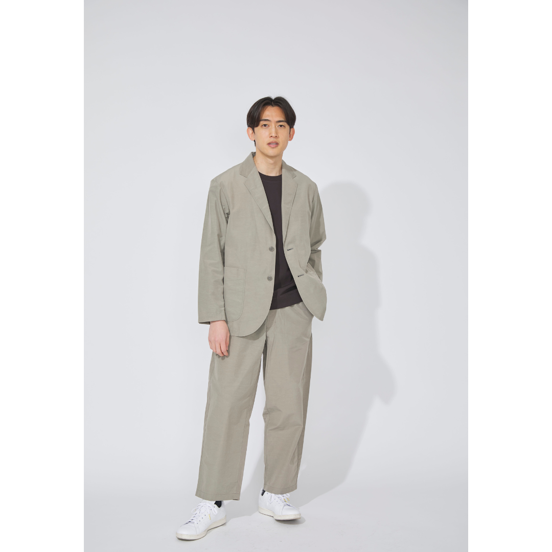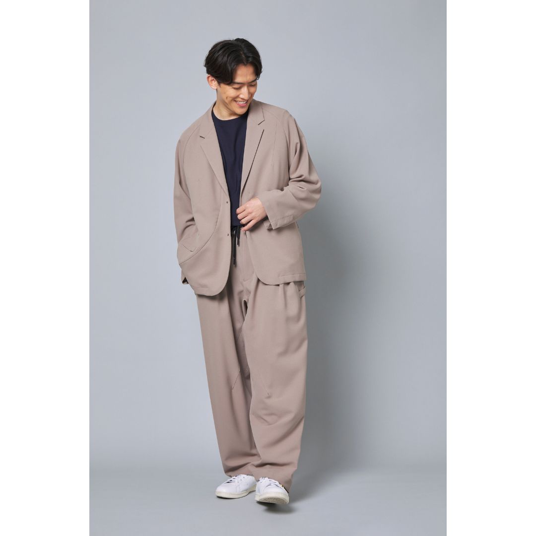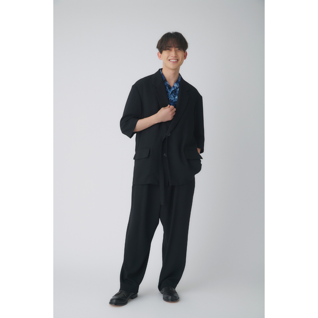 人と差をつけたい方は、ひと癖あるデザイン性が光るアイテムを取り入れてみるのもおすすめ。ウジョー(UJOH)のテーラードジャケットは、ハーフスリーブタイプで、ラペル裏から伸びるベルトでボタンを留める位置を調整すれば、1着で違う表情を楽しめます。ボトムスにもリラックス感ある同素材のワイドパンツを合わせて、抜け感のあるセットアップスタイルに。