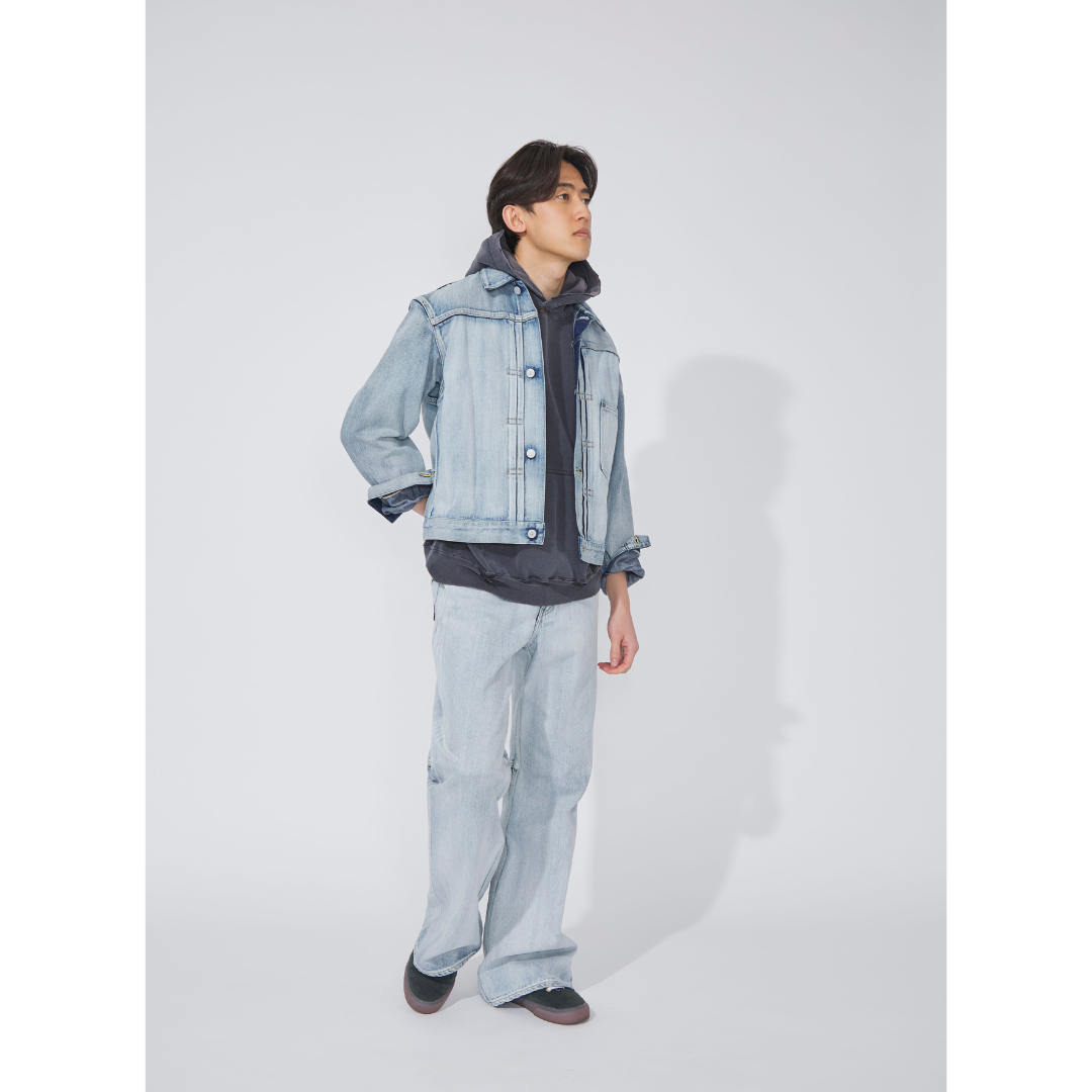 春を感じさせるアイスブルーが印象的なビューティフルピープル(beautiful people)のデニムセットアップ。インナーにはヴィンテージの風合い漂うスミクロのフーディベストをチョイスしました。ボトムスがストレートのフレアシルエットとなっているため、デニムとフーディーというカジュアルな装いの中にもどこか上品さが感じられるスタイリングに。
