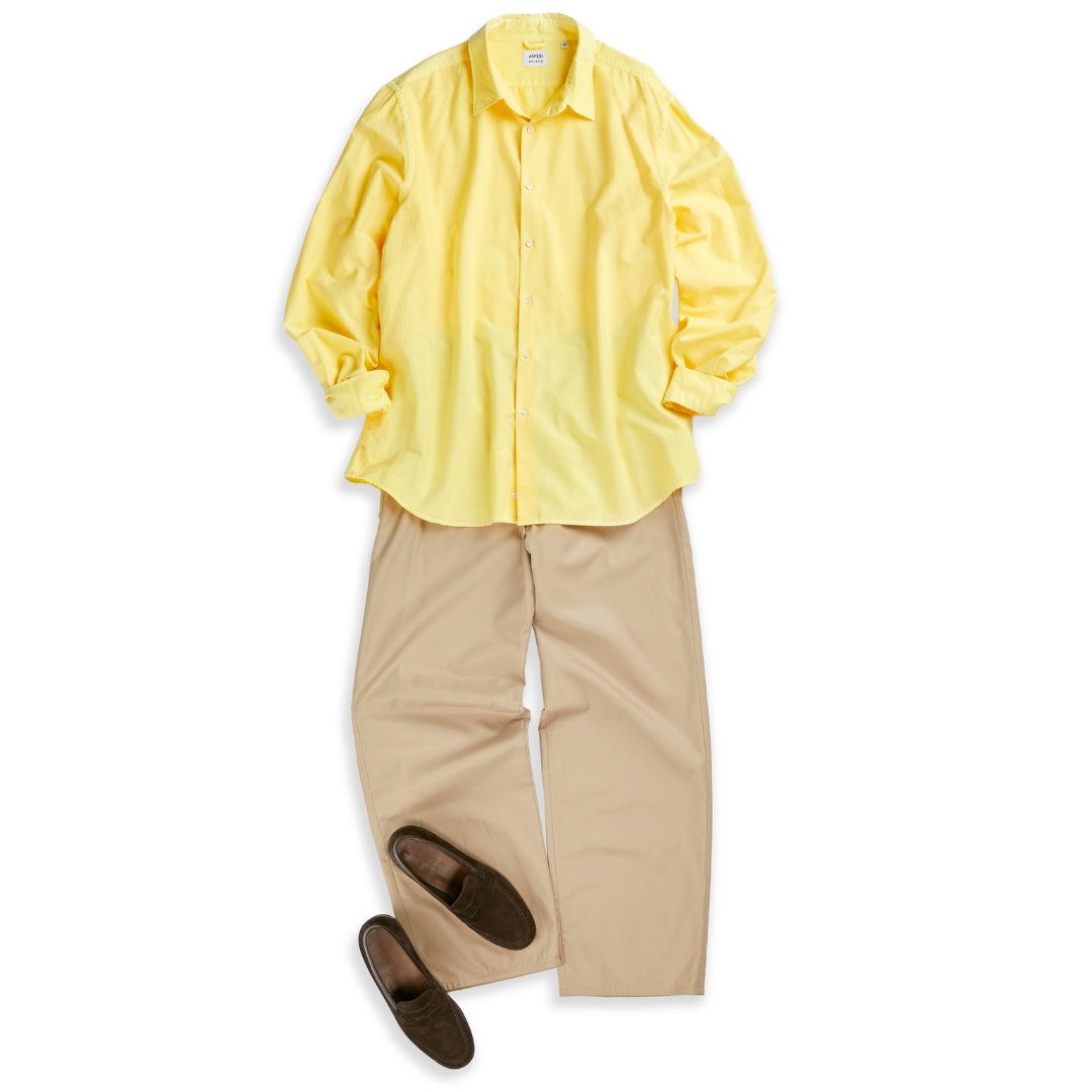 シャツ×チノパンの王道スタイルを、春仕様にアップデート。イエローのシャツを取り入れるだけで、一気に軽やかで季節感のある印象に。足元はブラウンローファーで引き締めれば、リラックス感ときちんと感を両立したスタイルの完成です。