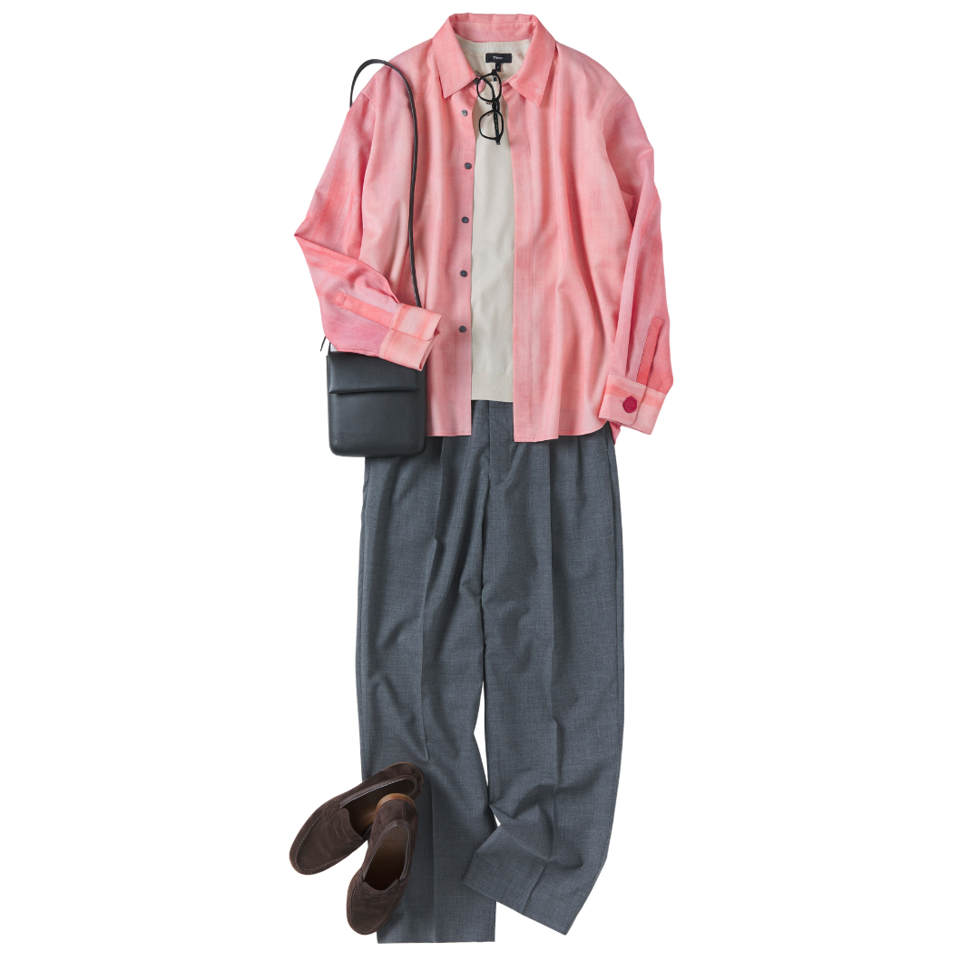 グラデーションが美しいピンクのシャツを主役にした、春らしいスタイリング。見る角度によって表情が変わり、装いに奥行きをプラスしてくれます。インナーとボトムスは落ち着いたカラーでまとめて、トップスを引き立てるバランスに。小物はブラックで統一することで、品よくまとまります。