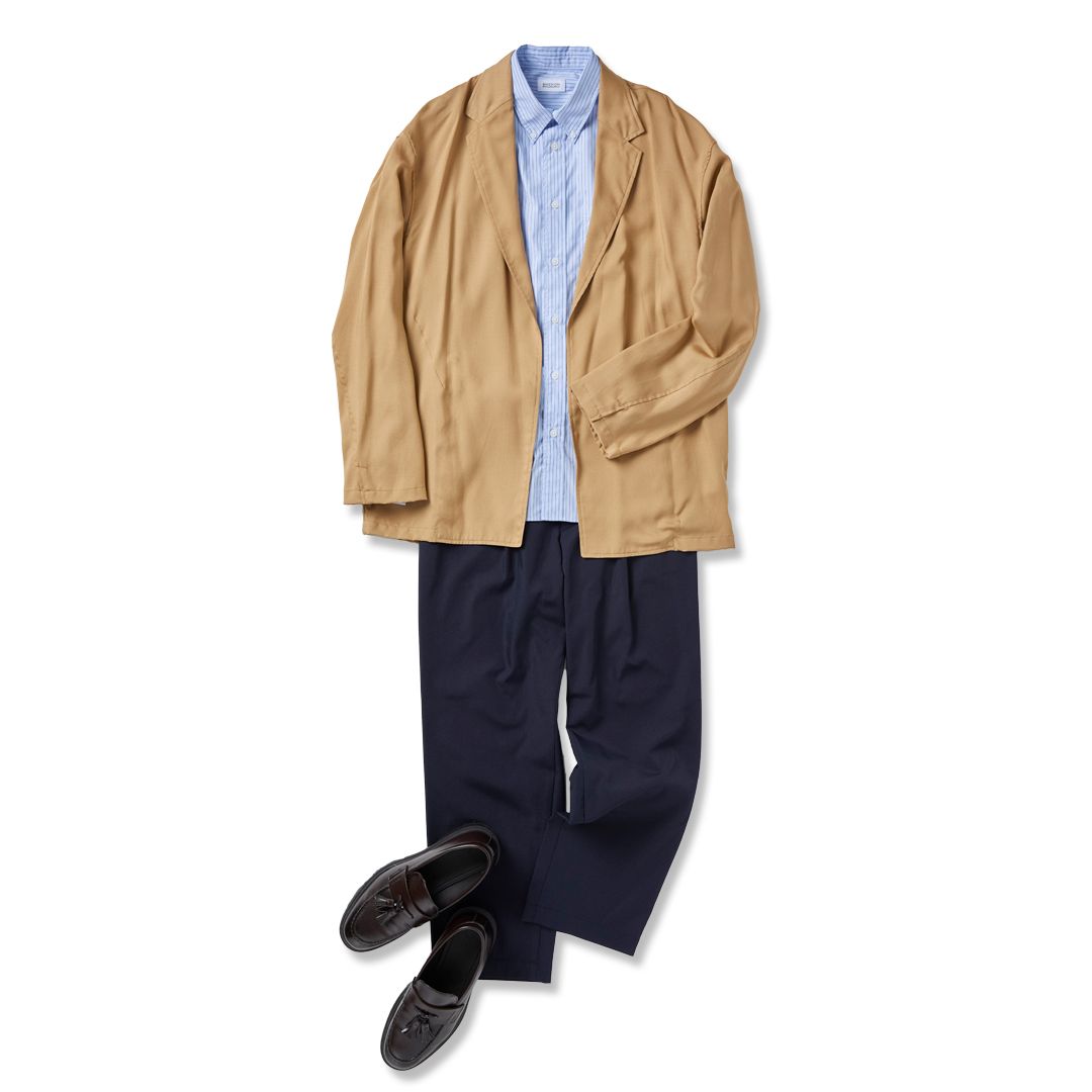 オフィスカジュアルやちょっとしたお出かけにも対応できる、きれいめカジュアルコーデ。ブルーストライプのシャツ×ネイビーのチノパンの落ち着いた着こなしに、軽やかなベージュのシャツジャケットを重ねることで、春らしさときちんと感を両立。足元はブラックのレザーシューズで上品に仕上げて。
