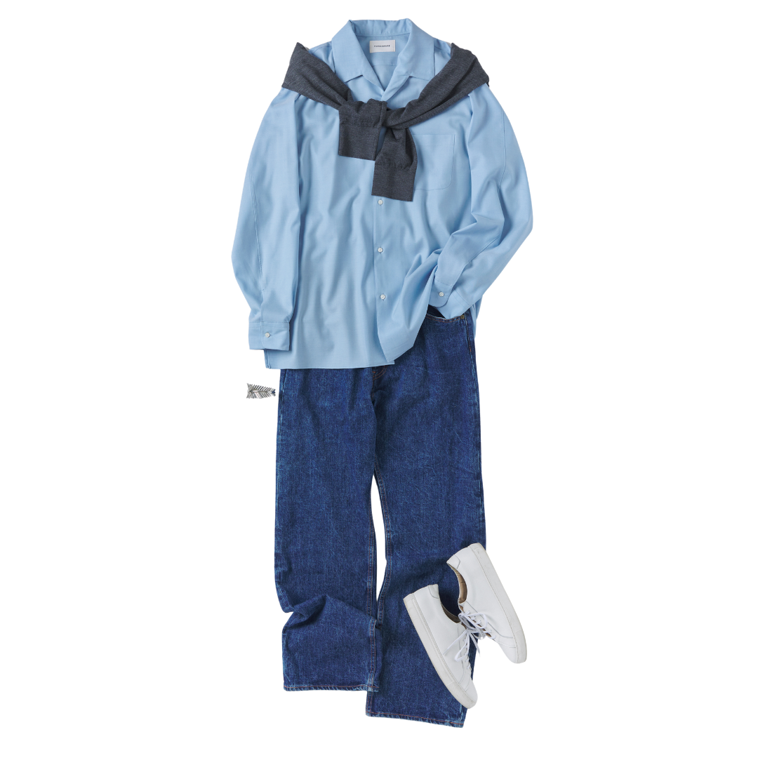 上品なイタリアンカラーが特徴のブルーシャツは、着るだけで清潔感漂う印象に。ボトムスにはストレートデニムを合わせて、程よくカジュアルダウン。肩からチャコールグレーのカーディガンを肩掛けすれば、シンプルながらも、こなれ感のある着こなしに仕上がります。