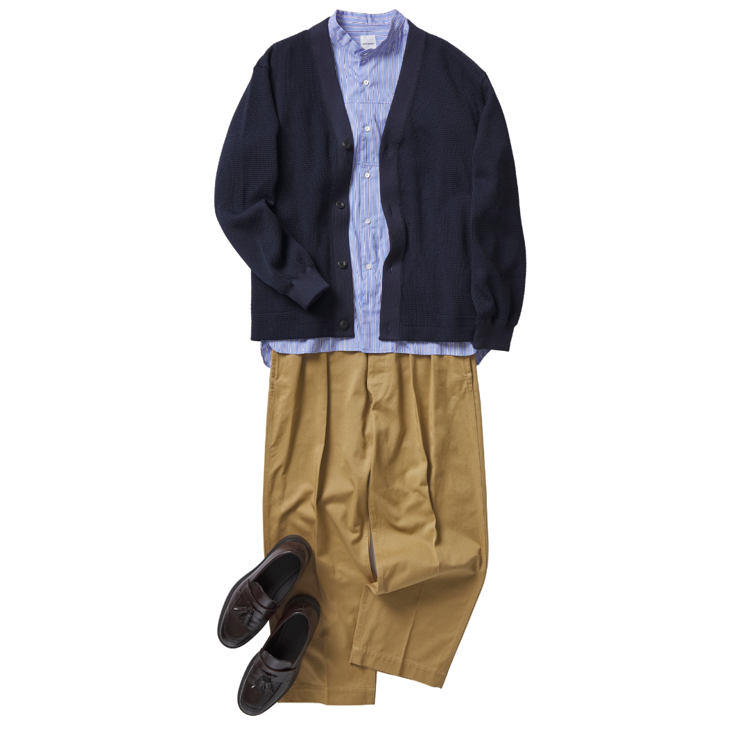 寒暖差のある春は、脱ぎ着しやすいカーディガンスタイルもおすすめ。今回は、ネイビーのカーディガンに、ブルーストライプのシャツとベージュのチノパンを合わせたきれいめカジュアルを提案。足元はスニーカーではなく、ブラウンのレザーシューズを合わせて、カジュアルすぎないバランスに。