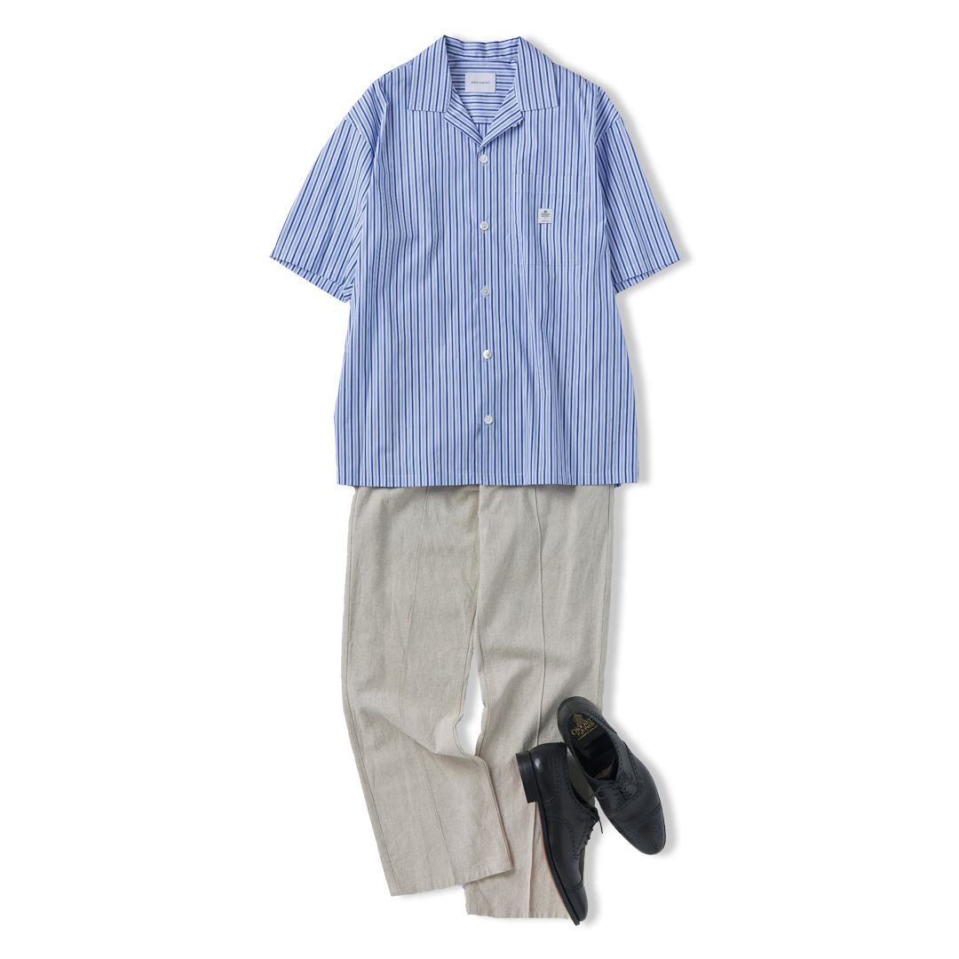 ブルー×ホワイトカラーでまとめた、夏にぴったりの涼感コーデ。シーク・ヤブーティ(SHEIK YERBOUTI)のシャツは、程よくゆとりのあるシルエットとオープンカラーが、スタイルにさりげない抜け感を演出してくれます。ボトムスには、綿麻素材の軽やかなスラックスを合わせて、見た目にも涼しげな印象に。足元はブラックのレザーシューズで引き締めて。