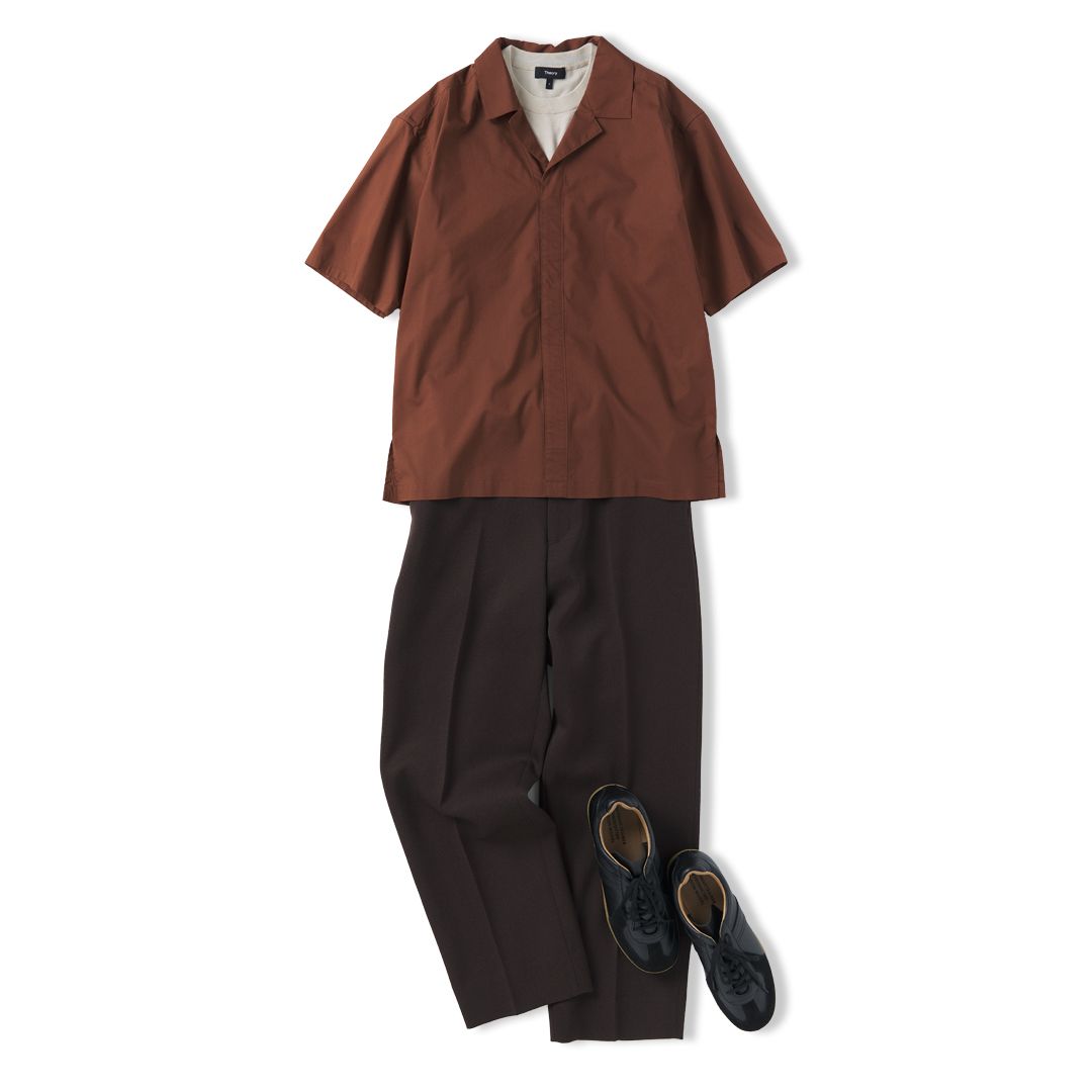 上下ブラウン系でまとめた、上品なワントーンコーデ。落ち着いたカラーながら、涼しげな素材とリラックス感のあるシルエットのおかげで、見た目以上に快適な着心地に。インナーには、全体にすっとなじむベージュのニットTシャツを合わせて抜け感を。