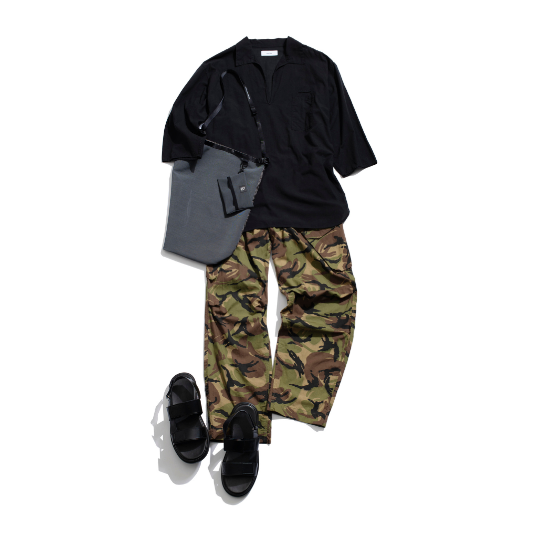 ブラックのスキッパーシャツにカモフラ柄のパンツを合わせた、きれいめミリタリーコーデ。カモフラ柄のパンツの存在感がある分、トップスはシンプルなアイテムでまとめるのがポイントです。足元はレザーサンダルで外して抜け感をプラスすれば、ミリタリーの無骨さを都会的に昇華したスタイルに。