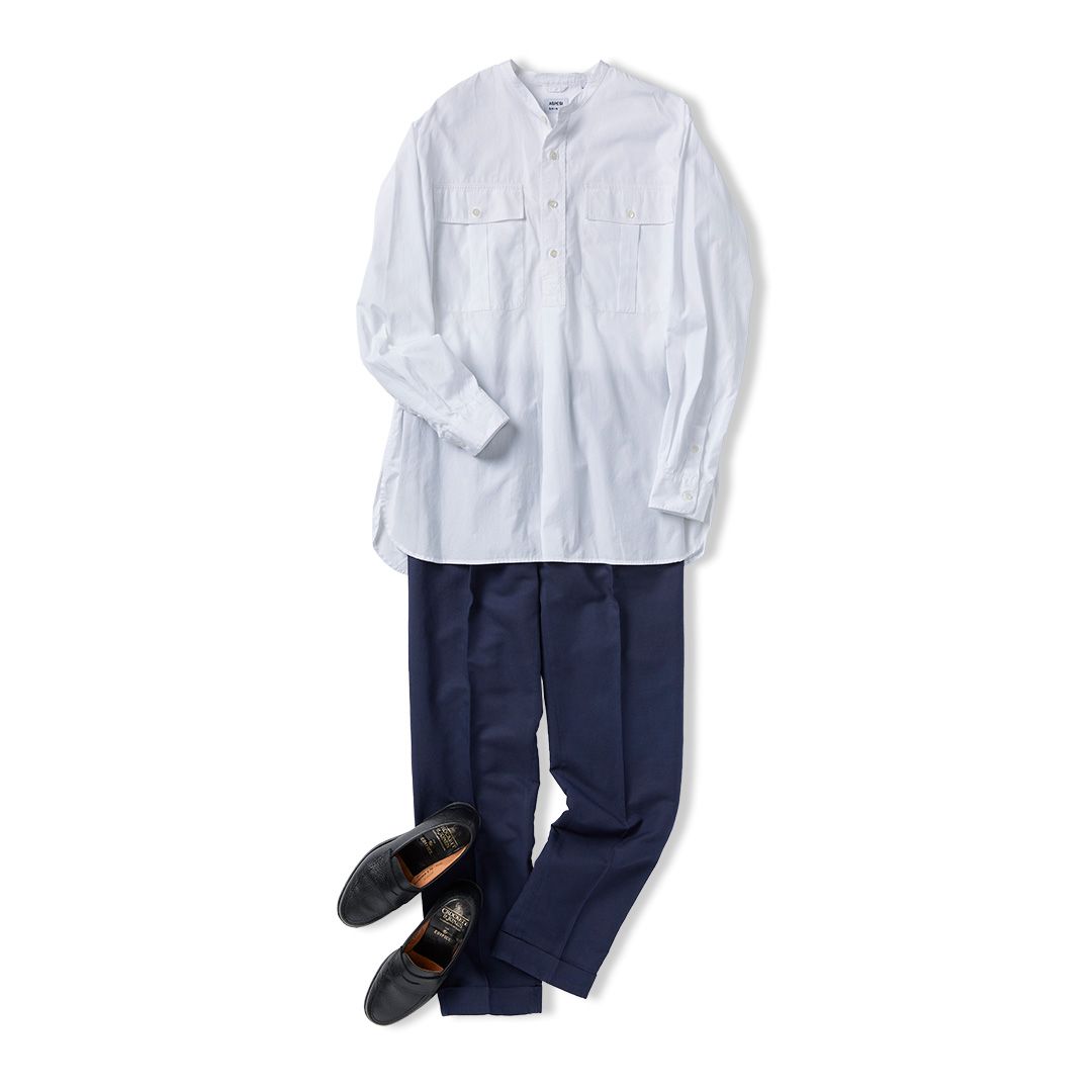 アスペジ(ASPESI)の白シャツは、薄手のコットン素材とゆったりめなサイズ感なので、夏でも涼しく着られるのが魅力。首元のボタンを開ければ、きちんと感の中に抜け感が生まれます。ボトムスにはネイビーのスラックスを合わせて、スタイリッシュにまとめて。