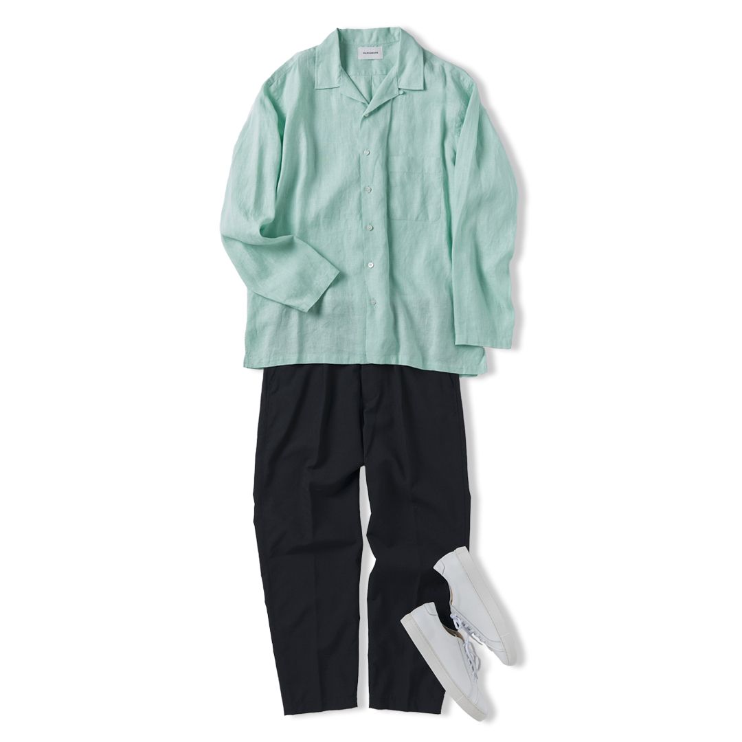 涼しいヘンプ生地のミントカラーのシャツを主役にした、爽やかな夏スタイル。ボトムスはブラックのパンツを合わせて、全体を引き締めつつ、トップスの引き立て役に。足元はホワイトスニーカーでクリーンにまとめれば、シンプルな組み合わせながらも、素材とシルエットで差がつくサマーコーデの完成です。