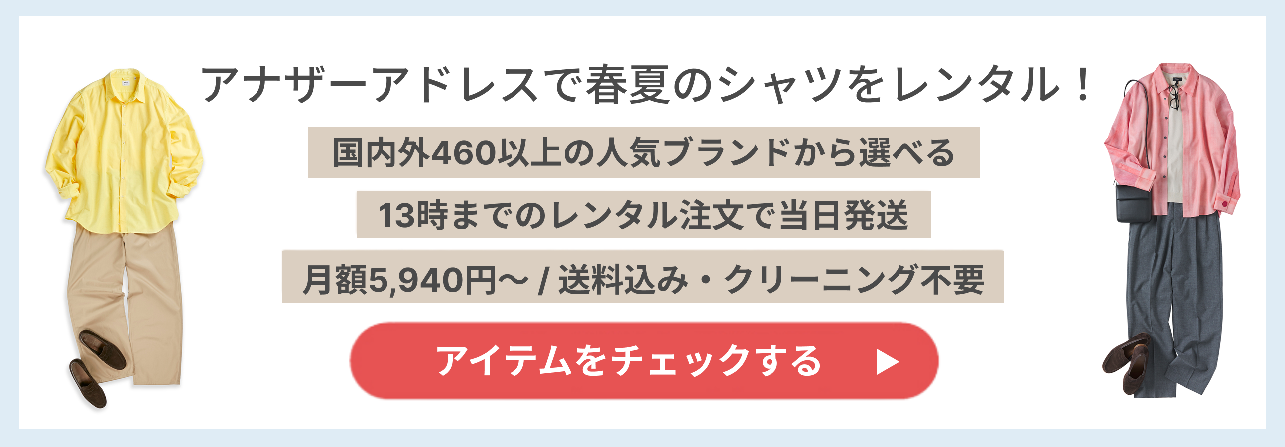 アナザーアドレスでは、今の時期やこれからの夏の時期に合うメンズシャツを豊富にご用意しています。「普段着ない色や柄にも挑戦してみたい」「似合うか不安なので試してみたい」と感じている方は、アナザーアドレスのレンタルサービスを利用して、春夏の着こなしをアップデートしてみてください。