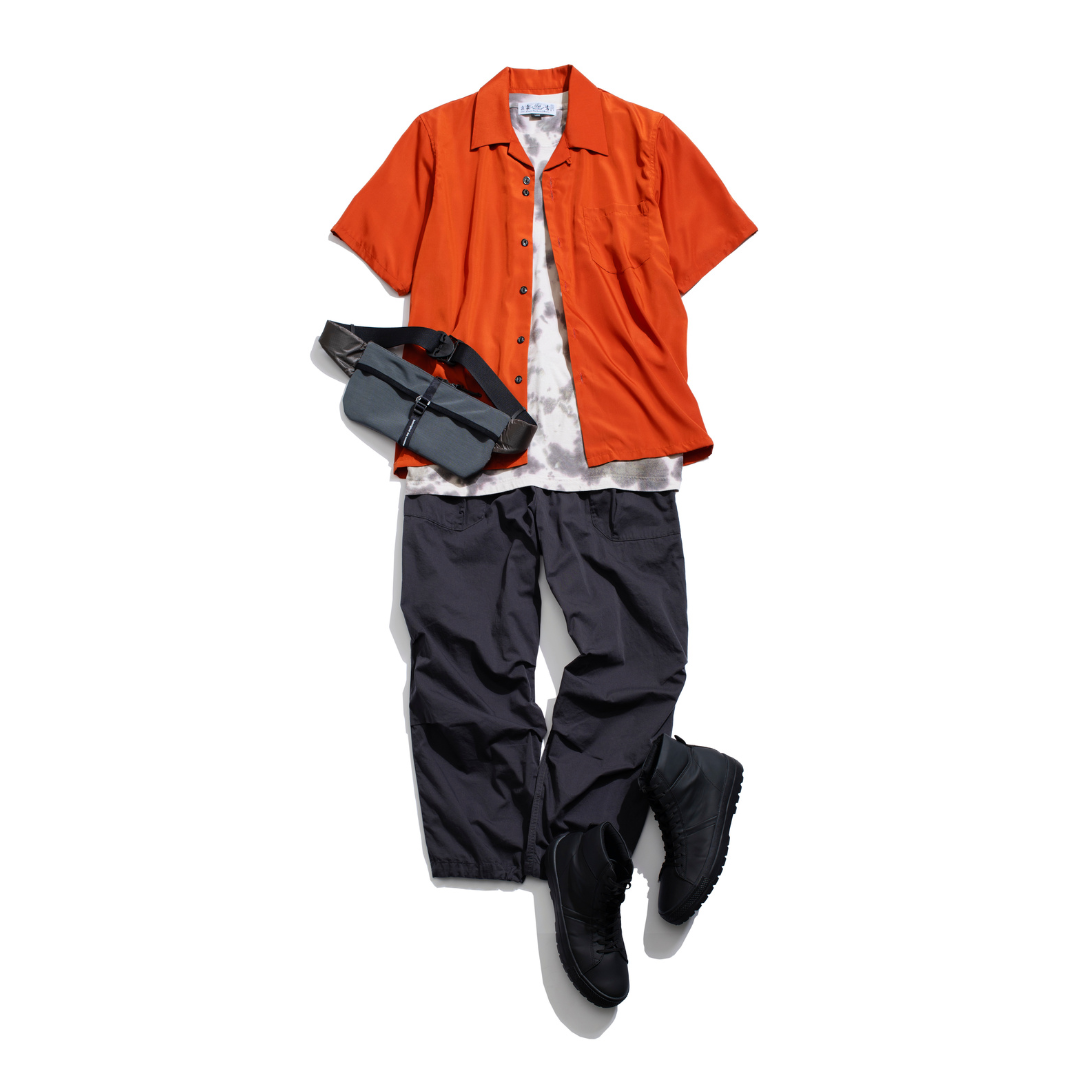 鮮やかなオレンジが映えるバル(bal)のシャツを使用した夏のアクティブコーデ。インナーにはタイダイ柄のTシャツを合わせ、着こなしに程よい遊び心をプラスしています。