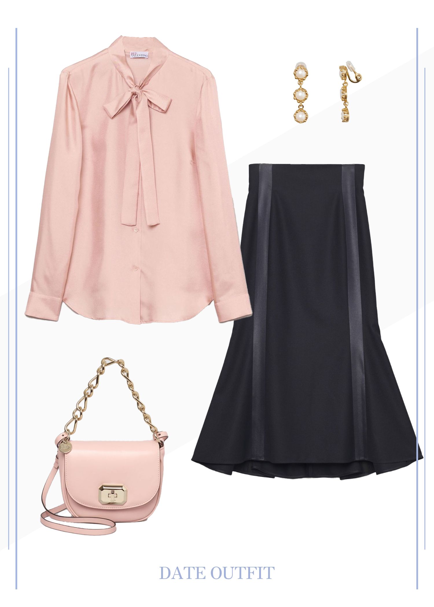 ピンクのブラウス×黒のマーメイドスカートで、洗練されたフェミニンスタイルに。ブラウスは、シルクの繊細なツヤ感と明るいピンク色が華やかさ抜群。スカートは、エレガントで女性らしいマーメイドシルエットを選んでいるのがポイントです。