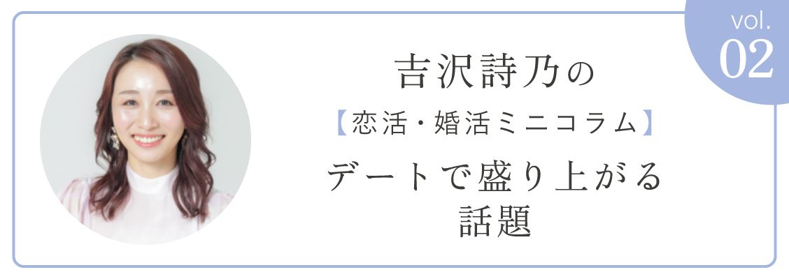 日本最大級の恋愛婚活スクール「総研アカデミー」を運営する吉沢詩乃さん。ここでは、幅広い年代の女性の婚約・入籍をサポートする恋活・婚活テクニックの一部をご紹介いただきます。第2回目のテーマは、「デートで盛り上がる話題」です。