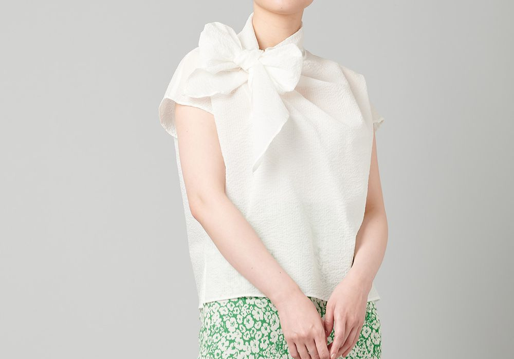 トップスは、ピンクや白、ブルーなどの顔映りが良く清潔感のある色合いのものがおすすめ。透け感のある素材や、フレンチスリーブ・ノースリーブで上品に肌見せすれば、女性らしさも演出できます。顔周りが寂しい印象にならないよう、襟元のデザインも意識すると◎。