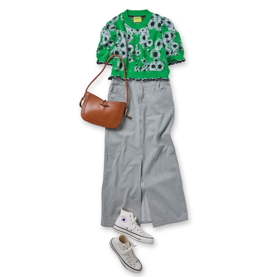 手元に淡いミントグリーンのバッグを合わせて差し色にすれば、初夏らしい爽やかさもプラス。きらっと輝くシルバーイヤリングで顔まわりに華やぎを添えれば、気分まで晴れるような大人の6月下旬コーデに。