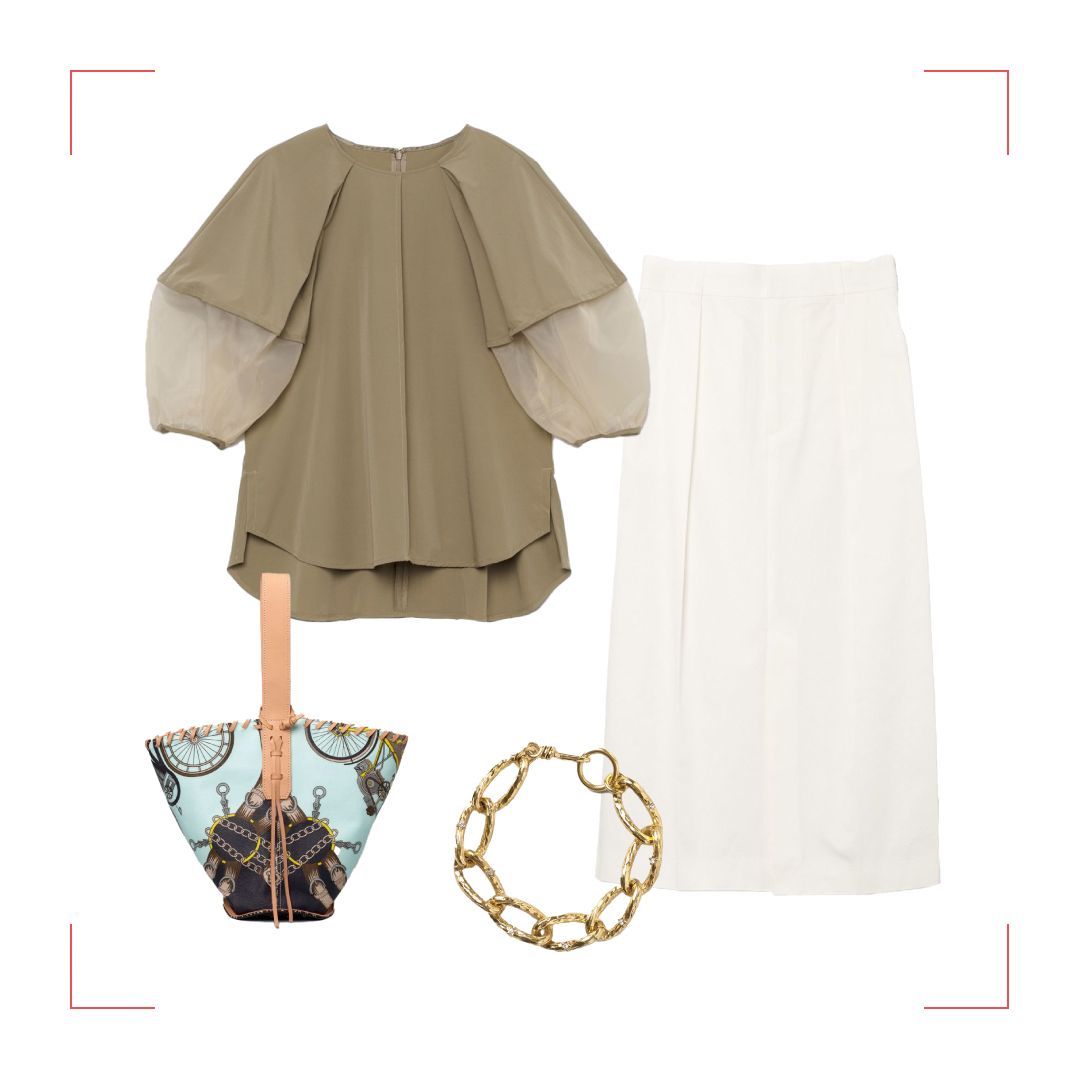 軽やかなシアーの袖が印象的なフェミニンなブラウスに、ストンと落ちたフレアスカートを合わせたコーディネート。やわらかな素材やフォルムが生む甘さを、直線的なシルエットがすっきりとシックに整えてくれます。また、カーキベージュと清潔感のある白の落ち着いたコントラストが、フェミニンな中にほどよい芯を感じさせてくれる点も魅力。ゴールドのチェーンブレスレットとバッグのチェーン柄で統一感を演出し、凛とした華やぎをプラスしました。