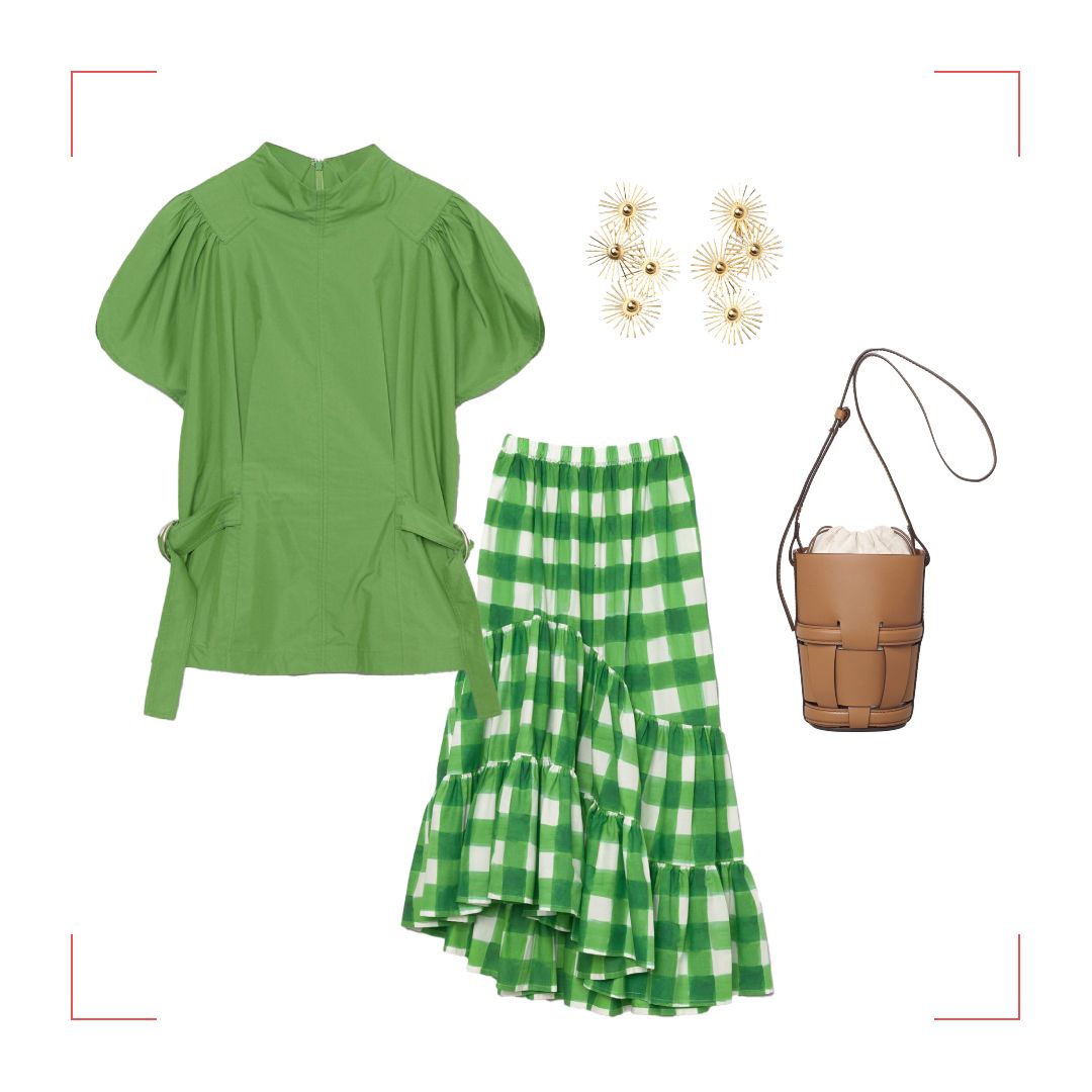 気負いのない明るいグリーンのブラウスは、チャーミングさを自然に引き出してくれます。そこに大胆なチェック柄のスカートを合わせて、視線を引き寄せる華やかさをプラス。同じトーンを重ねることで鮮やかさが際立ち、光をまとったような雰囲気に。