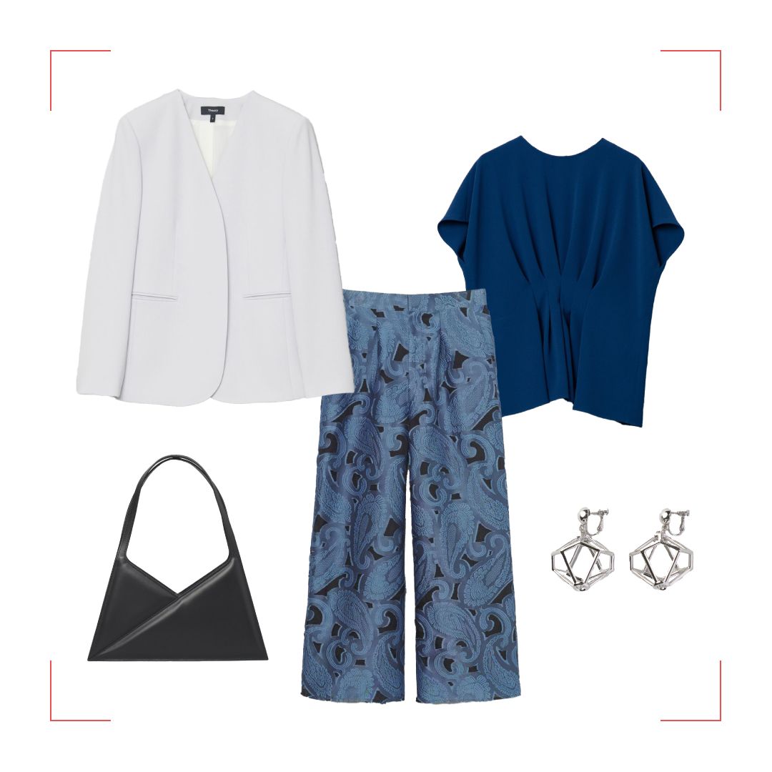 きちんと感のあるノーカラージャケットと、ミニマルなデザインのブラウスは、ブルーやグレーの涼しげな色遣いも相まって知的な印象を演出してくれます。ボトムスは大胆なペイズリー柄のパンツを合わせ、コーディネートに抜け感をプラスしました。