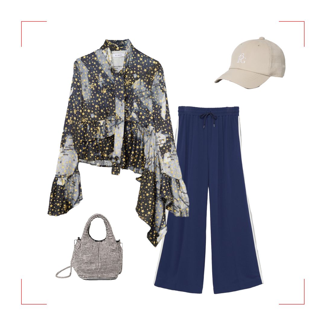 また、大胆なコーディネートには小物使いも重要なポイント。ラインストーンがきらめくバッグで華やかさを維持しつつ、モードすぎないようにベージュのキャップでカジュアルさをプラスしました。