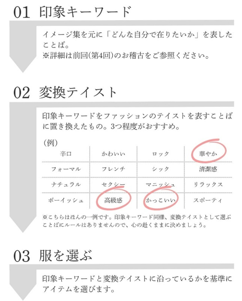 印象キーワードは、「どんな自分で在りたいか」という感覚を言葉にした、イメージの種のようなもの。しかし、それをそのまま装いに落とし込むには、少し距離があります。