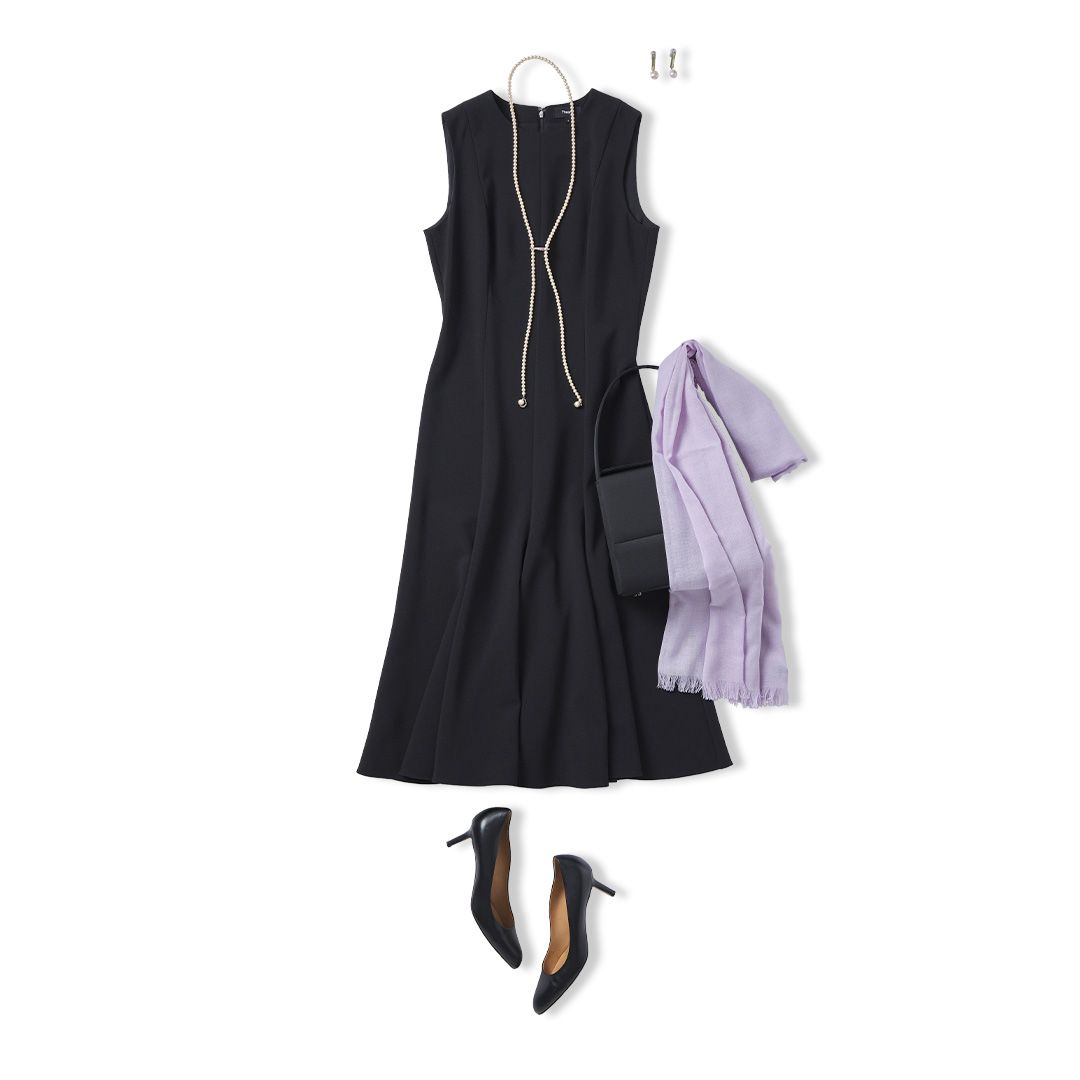 ブラックのスリーブレスドレスに、ラベンダーカラーのストールを肩からふわりと羽織れば、肌の露出を抑えつつ、女性らしい上品なアクセントに。小物は、パールアクセサリーと、黒のパンプス&バッグでフォーマルにまとめて。控えめながらもセンスが光る、親族のお呼ばれスタイルが完成します。