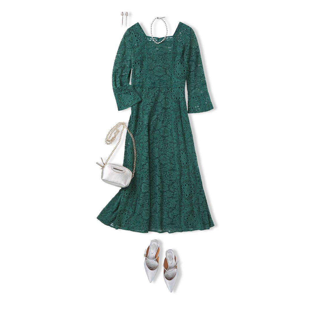表情豊かで華やかさ抜群のレース素材のドレス。深みのあるグリーンを選べば、落ち着きと品のある着こなしが叶います。こちらのジルスチュアート(JILL STUART)のドレスは、腰まわりがスッキリとしたAラインシルエットで、スタイルアップして見えるのも嬉しいポイント。