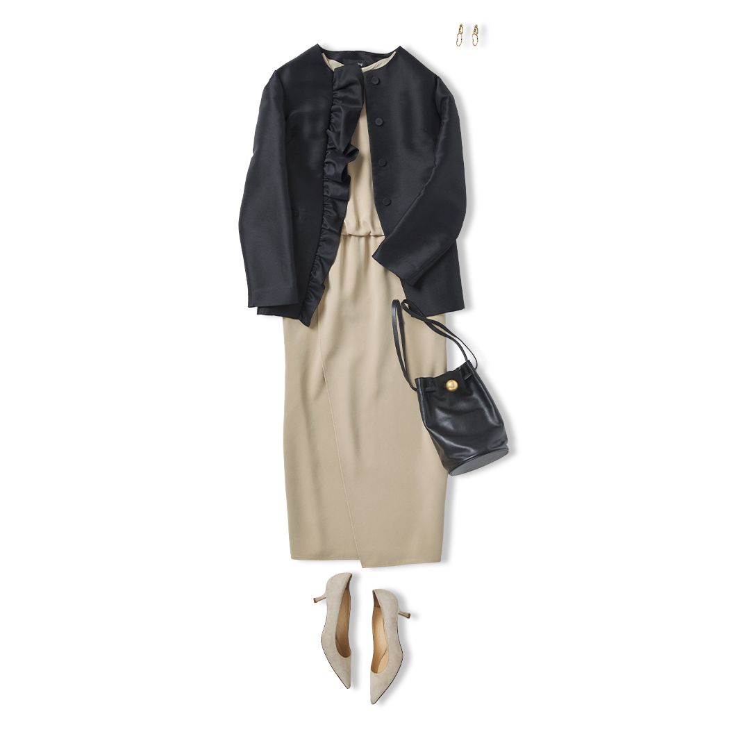 落ち着いたベージュのワンピースに黒のジャケットを羽織れば、スピーチにも対応できるきちんと感のある装いに。ジャケットは、程よい光沢感やフリルデザインがアクセントになり、上品な華やかさもキープ。上司や同僚の前でも好印象な、洗練されたフォーマルスタイルが完成します。