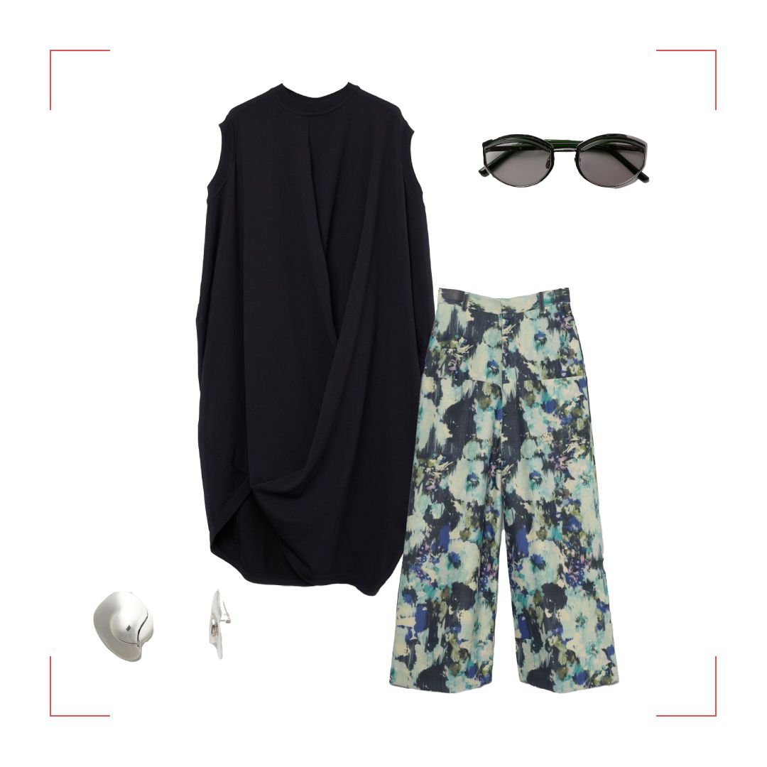 大胆シルエット×柄の合わせ技で、“自分らしさ”を際立たせるスタイル。立体的なオーバーサイズトップスに柄パンツを組み合わせることで、シンプルながらしっかり存在感のあるコーデに。