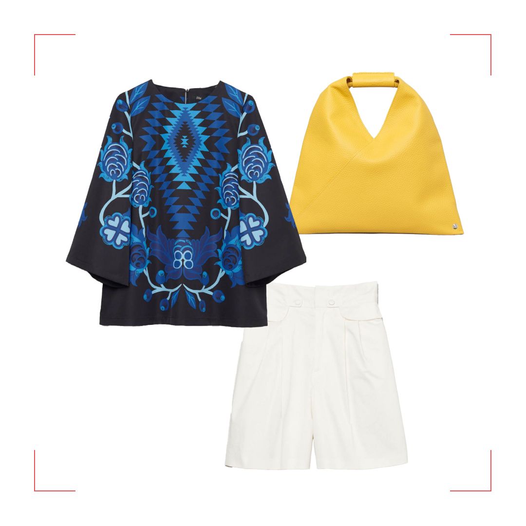 ボトムには品のあるショートパンツを合わせて、抜け感と軽快さをプラス。反対色のイエローのバッグがコーディネートのアクセントになり、視線を引き寄せます。足元は肌のトーンを活かし、軽やかさを演出できるヌーディーなサンダルを合わせるのがおすすめです。