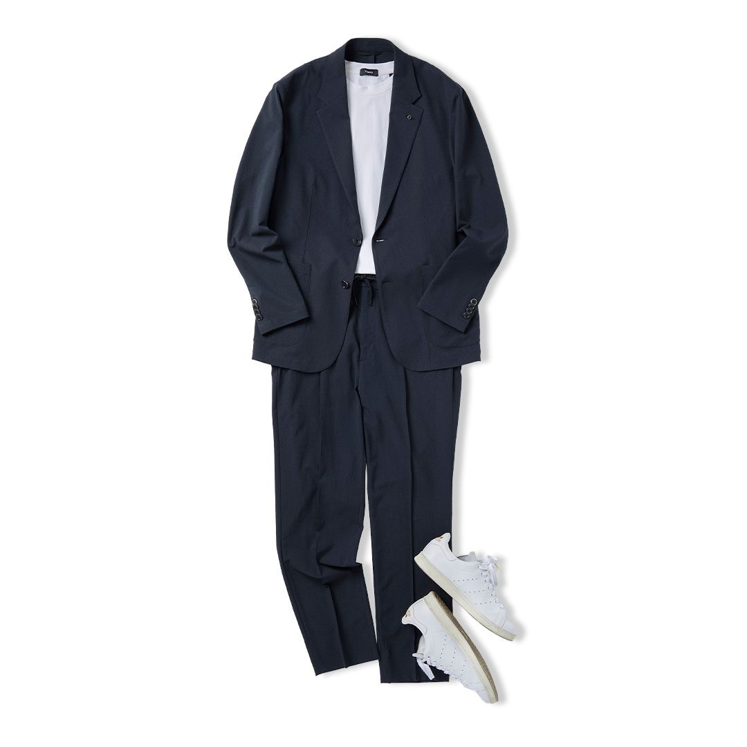 かしこまり過ぎないようにインナーにTシャツ、シューズはスニーカーを合わせ、こなれ感のある雰囲気に仕上げました。