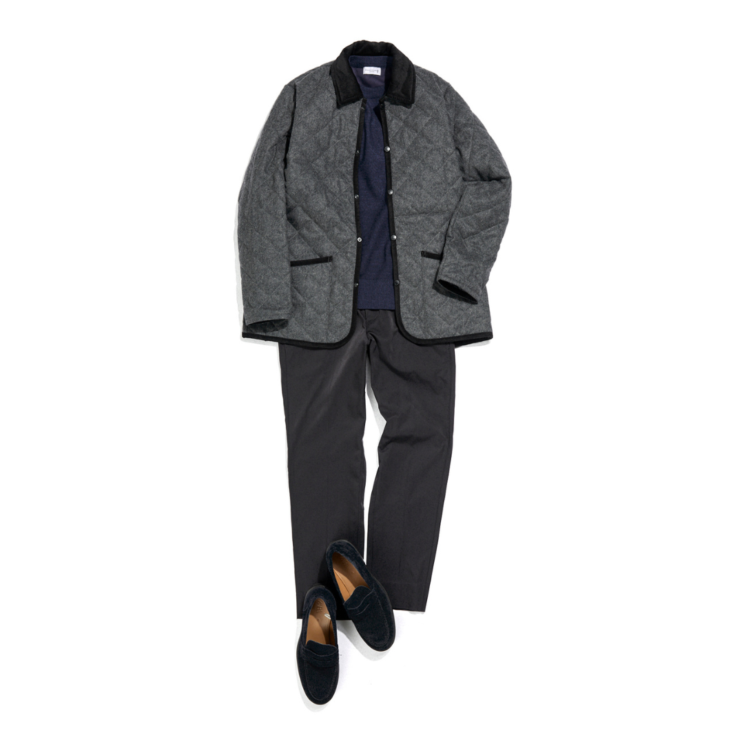 全体的にモノトーンでまとめた、大人の冬スタイル。ラベンハム(LAVENHAM)のアウターは、軽量で保温性が高いのが特徴です。中綿アウターですが、すっきりとしたサイズ感なので、肩幅のある骨格ストレートの方でも着ぶくれしにくい点はグッド。