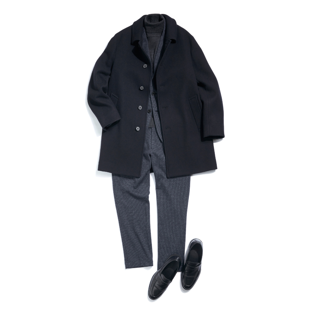 インナーに選んだ、ほどよく肉厚なジャストサイズのネイビーのニットは、落ち着いた印象を与えてくれます。ボトムスにはスマートに見えるテーパードパンツ、足元はスエードのローファーを合わせて、品のある雰囲気に。冬のデートやショッピングでも好感触なコーディネートです。