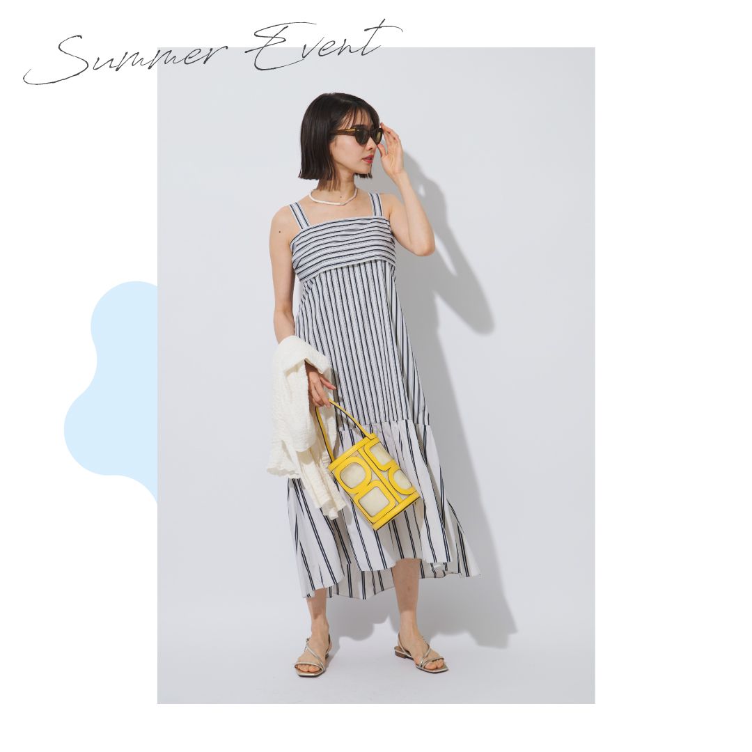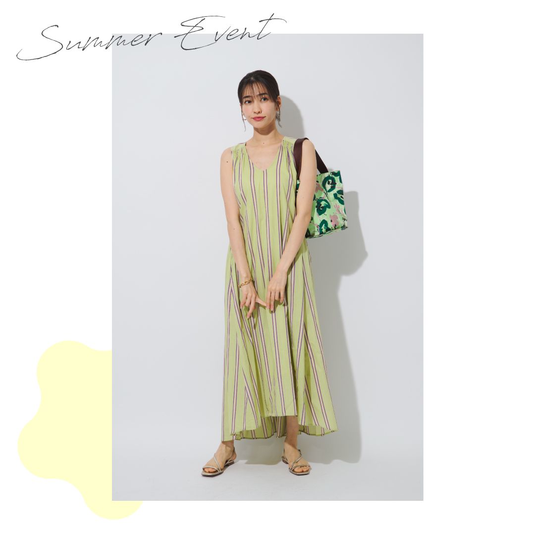 浴衣以外なら、涼しく楽ちんに着られる、華やかなデザインのワンピースが大活躍。スリードッツ(three dots)のストライプ柄ワンピースは、ふんわりと風をはらむAラインシルエットで、暑さや混雑のなかでも快適に過ごせます。