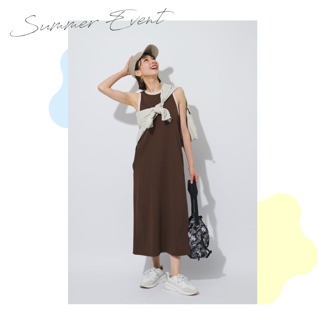 炎天下のなか、一日中屋外で過ごすこともある夏の音楽フェス。動きやすさに暑さ対策、そして着映えも欠かせません。今回は、リラクシーな着心地のジャージー素材のノースリーブワンピースで、ヘルシーな装いに。今期注目のブラウンを選べば、旬なムードも演出できます。
