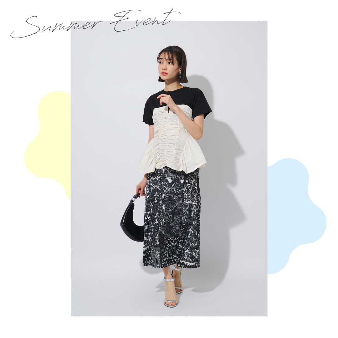 トップスは、旬のペプラムビスチェがドッキングされたTシャツをセレクト。ボトムスはレース柄プリントのスカートを合わせて、華やぎをプラスして。ミニマルな黒のバッグを持てば、赤リップが映える大人可愛いモノトーンスタイルが完成。