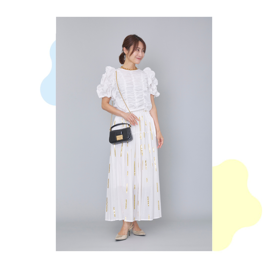 オールホワイトコーデで、ピュアなムードに。ふんわり揺れるフレアスカートにシャーリングブラウスを合わせれば、夏祭りデートにぴったりな大人かわいいコーディネートが完成します。トップスやスカートがフェミニンな印象を与えるぶん、バッグは辛口デザインを選ぶと好バランス。大人の甘辛MIXコーデを楽しんでみてください。