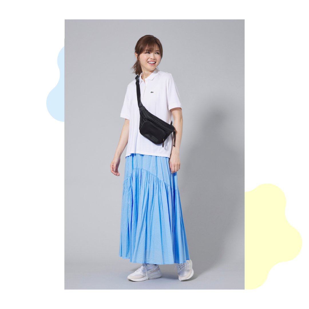 あえてのカジュアルスタイルなら、2025年春夏のトレンドアイテム「ポロシャツ」を取り入れて。スカートとも相性抜群で、ラフすぎない大人のカジュアルスタイルが完成します。白×ブルーの配色で、夏の蒸し暑さも吹き飛ばす、軽快でクリーンなコーディネートに。