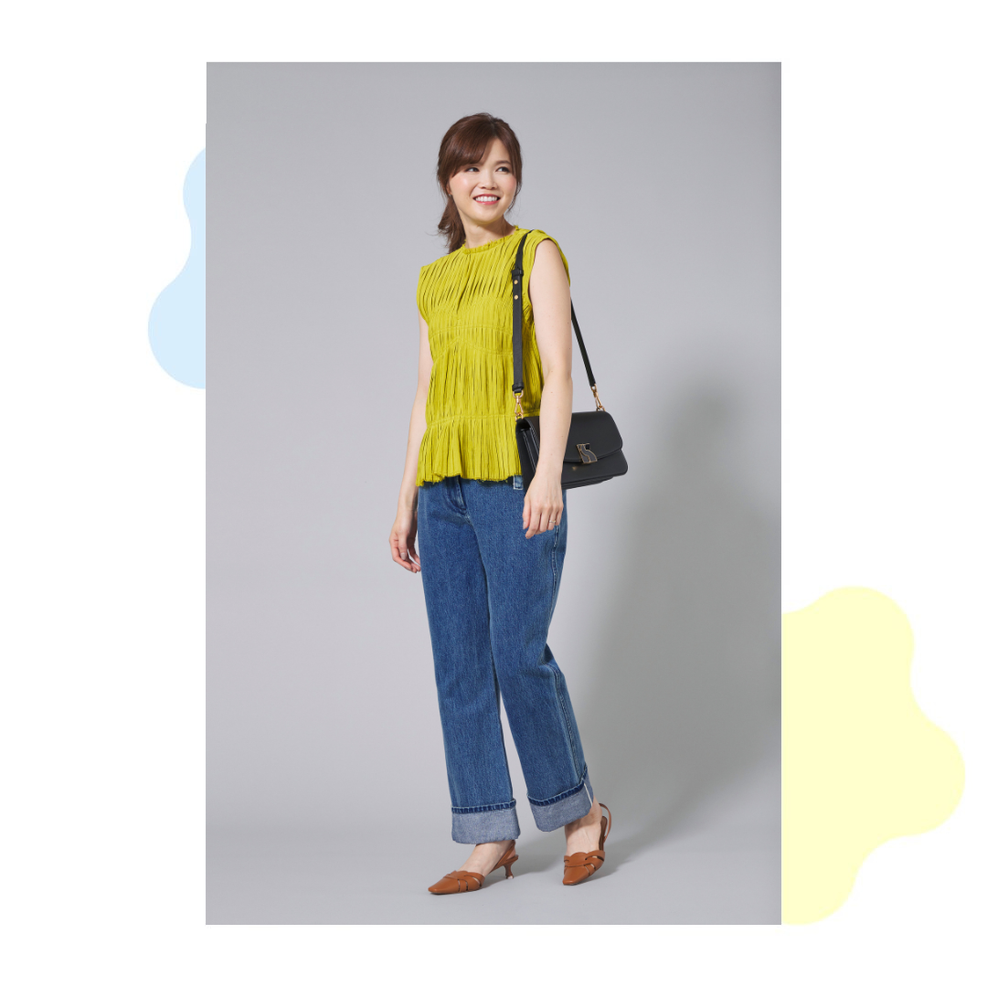 夜に映える鮮やかなグリーンのブラウスに、デニムパンツをあわせたカジュアルコーデ。ボディラインに沿うブラウスで女性らしさをキープしつつ、カジュアルで親しみやすいムードを演出できます。デニムは程よくゆとりのあるシルエットを選べば、座っていても楽ちん!