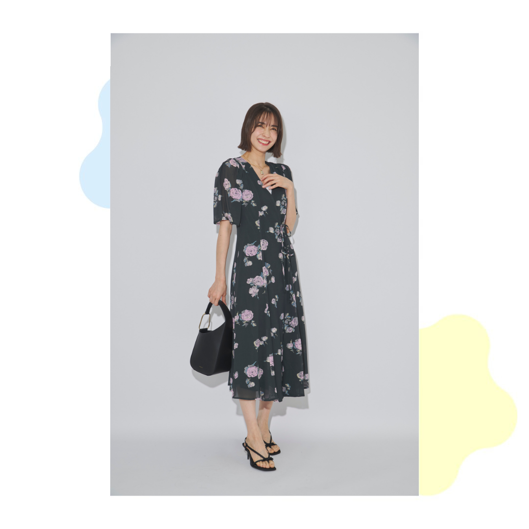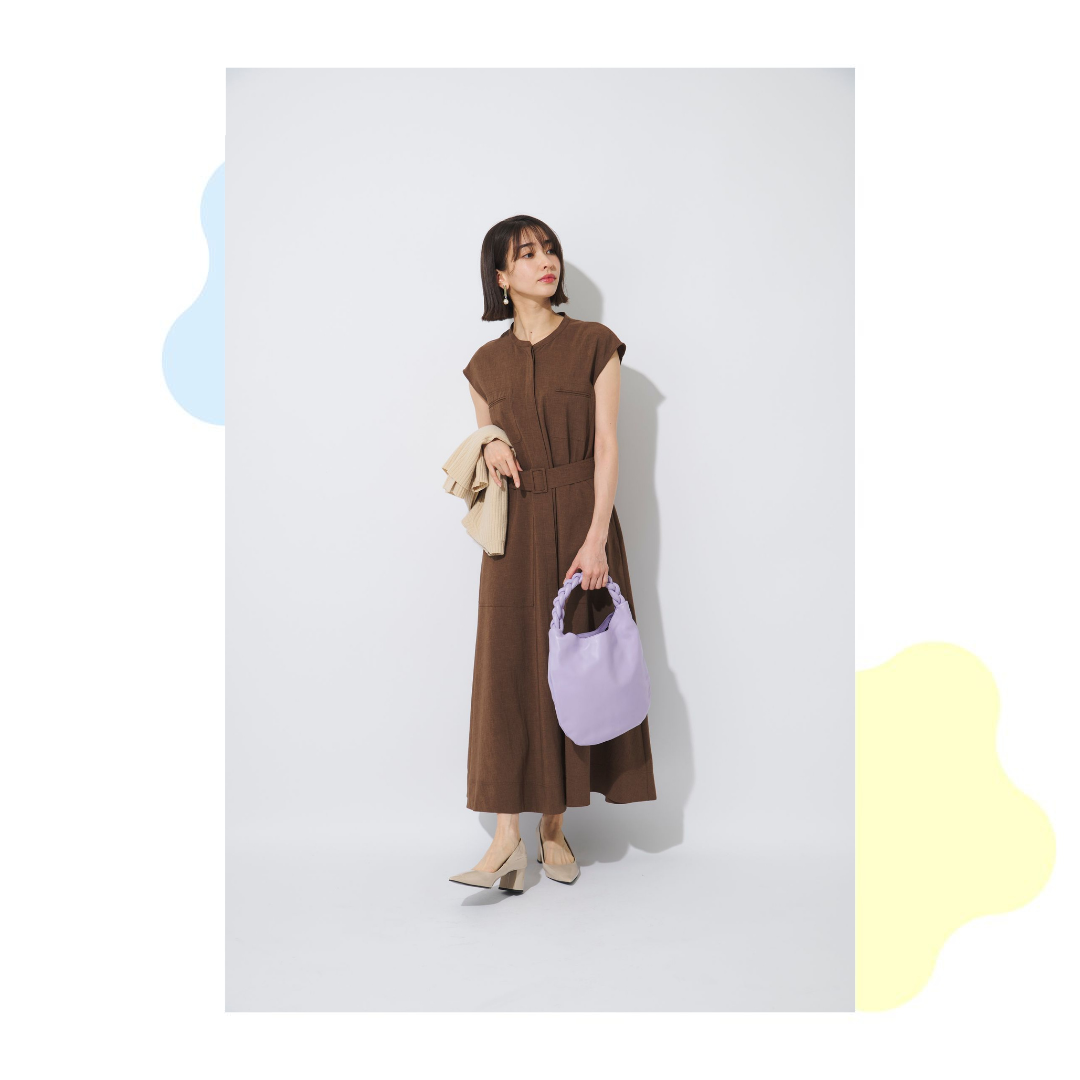 きれいめなデザインのワンピースなら、涼しく楽な着心地をキープしつつ、上品な印象に。ロング丈や、シアー素材・落ち感のあるデザインを選べば、程よい華やかさの“大人の装い”を楽しめます。今回は、落ち着いたブラウンのワンピースに、ラベンダーのバッグを合わせて、甘すぎない女らしさもプラスしました。