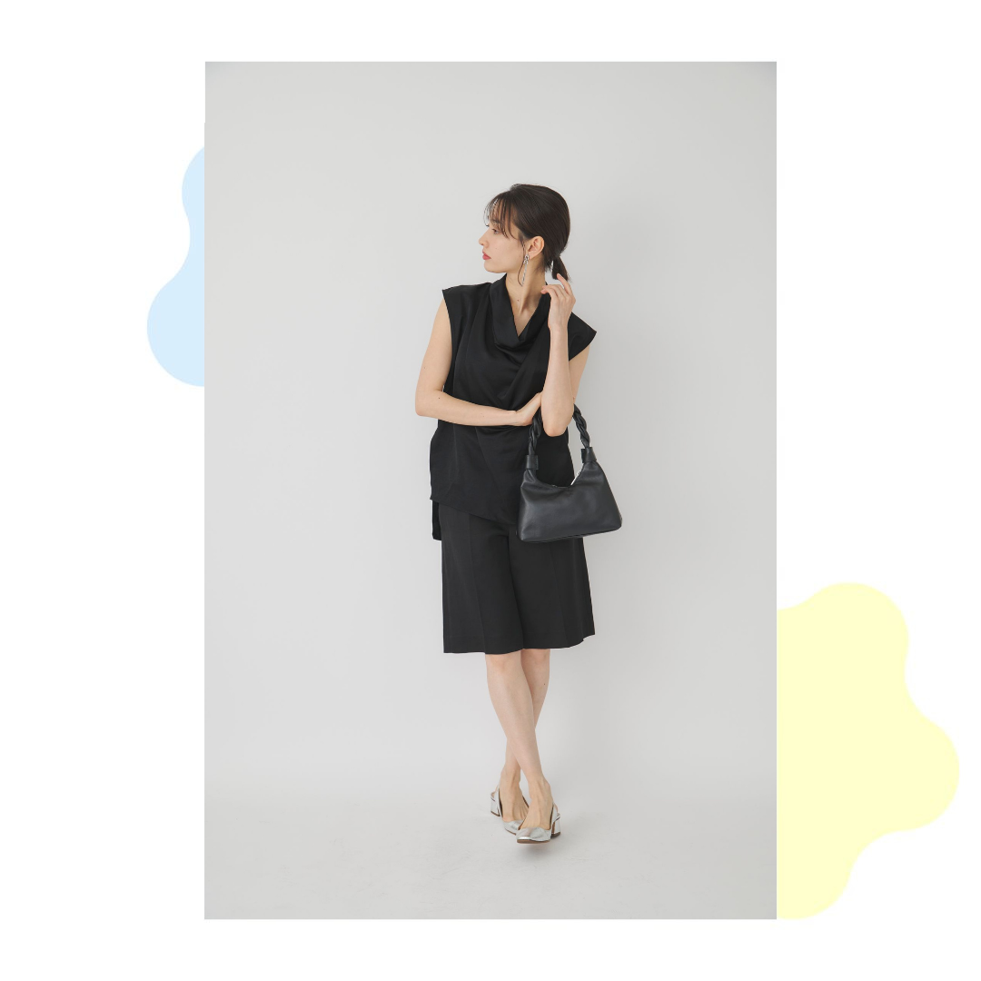 動きやすさ重視のハーフパンツコーデも、コーディネート次第で大人顔に仕上げることが可能。例えば、トップスにドレープの効いたノースリーブブラウスを合わせれば、スタイリッシュで凛とした空気感に。全体をモノトーンでまとめれば、センシュアルで大人らしい雰囲気にまとまります。