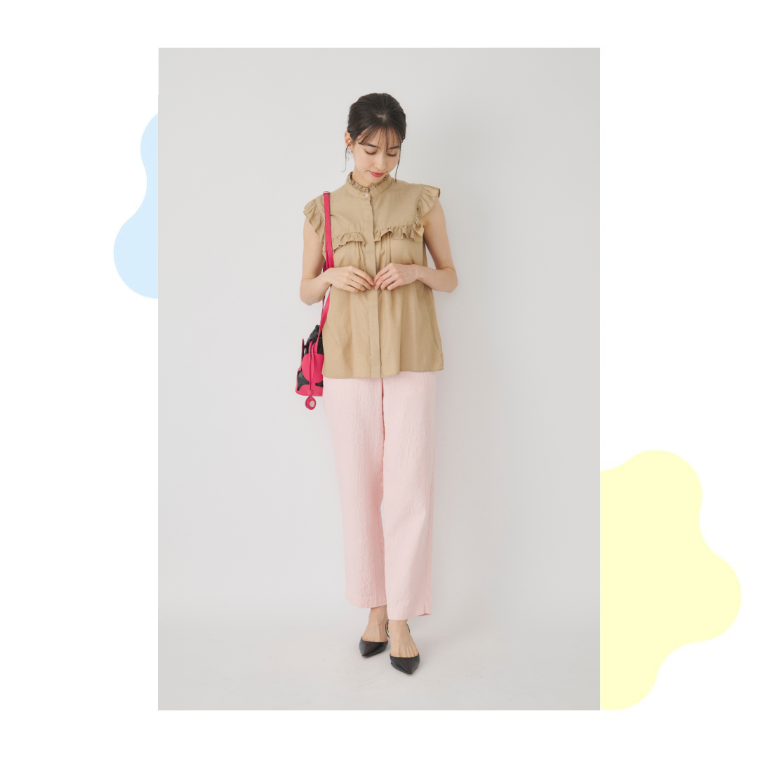 可愛さも快適さも妥協できない花火大会や夏祭りデート。パンツスタイルなら、色やデザインで甘さを演出するのがおすすめ。例えば、袖にたっぷりとフリルがほどこされたブラウスに、淡いピンクのパンツを合わせれば、程よいラフさが余裕を醸すフェミニンコーデに。パンツは、風通しの良いワイドシルエットや、涼しく穿けるリネンなどの夏素材のものを選ぶと快適に過ごせます。