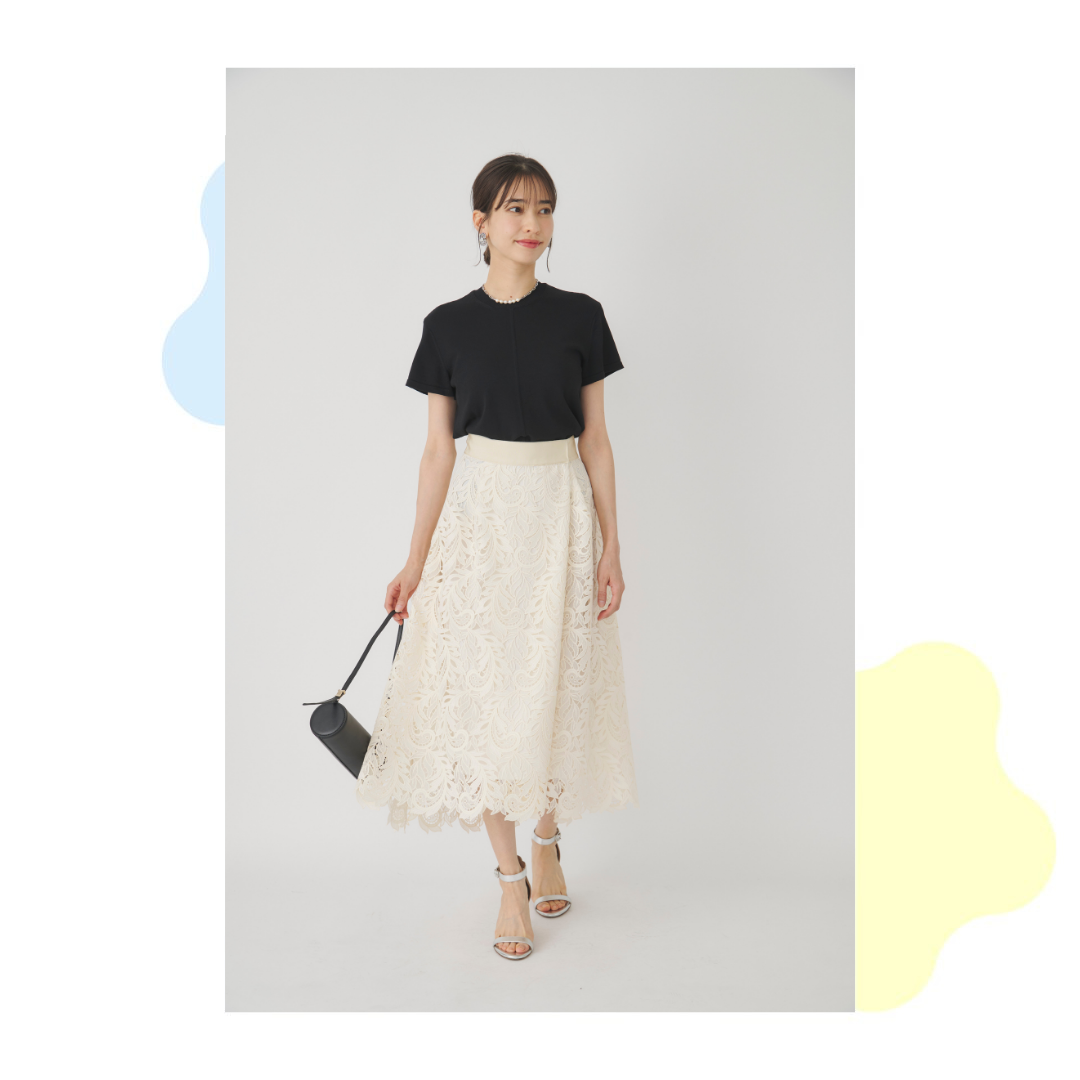 総レースのフレアスカートなら、簡単に華やかで品の良い花火大会コーデが完成。トップスにはあえてカジュアル見えする黒のニットTシャツを選んで、ラフさをプラスして。飾りすぎない余裕のある雰囲気が魅力の、大人の花火大会スタイルが完成します。