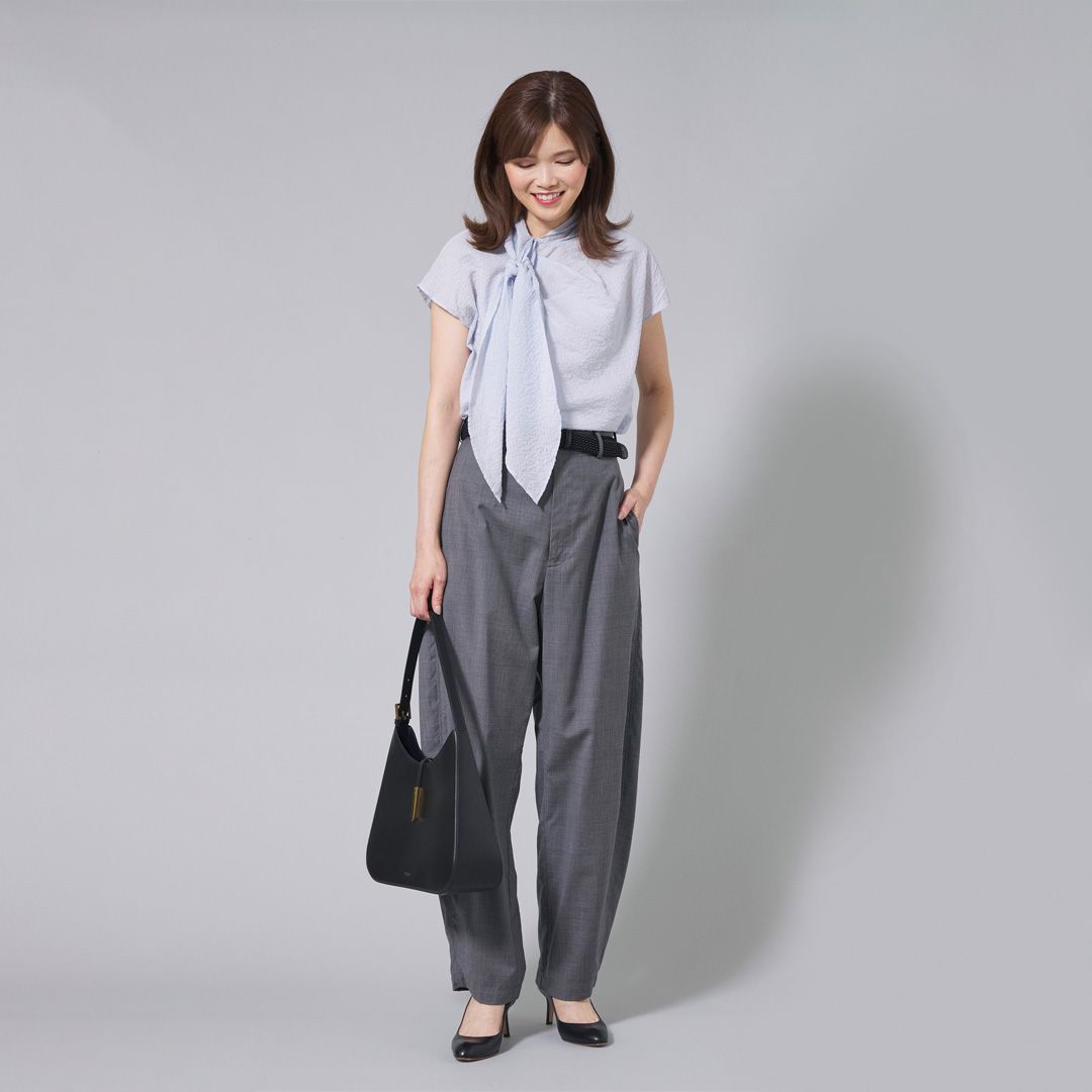 淡いブルーのブラウス×グレーのパンツで、涼感ただよう夏のオフィスカジュアルに。顔まわりを華やかに見せてくれるボウタイが、爽やかな着こなしにリズムを添えます。シンプルなパンツに黒小物を合わせれば、ぐっとクールで洗練された印象に。